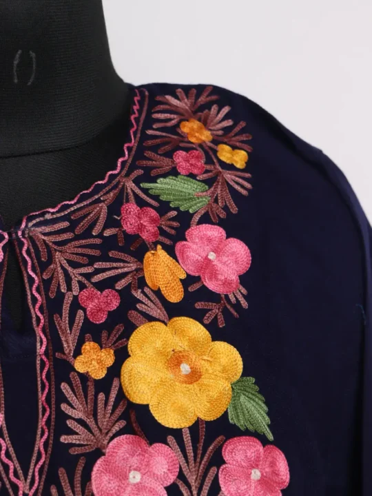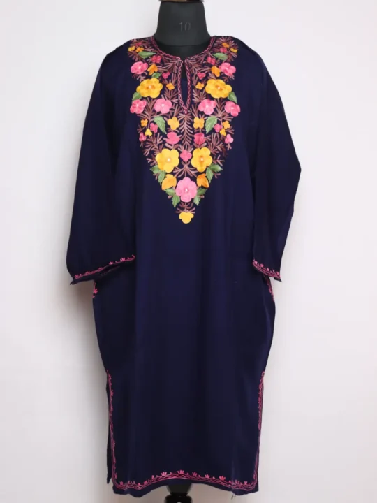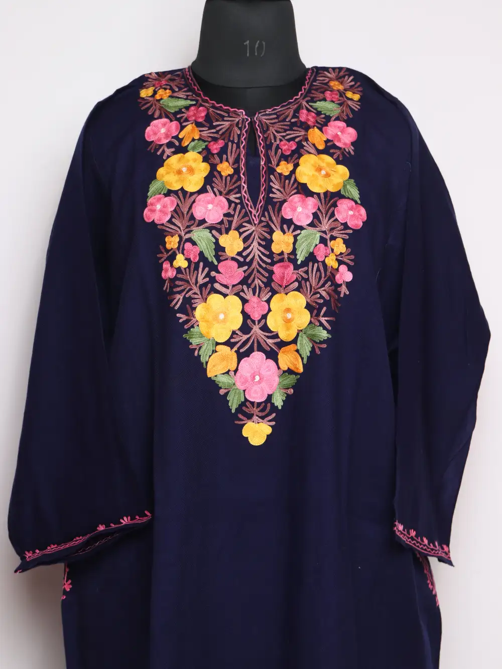 warm and elegant dark blue Cashmilon pheran with floral aari embroidery around the neckline and the colors create a vibrant, festive look. its soft touch ensures cozy comfort, enhanced with two side pockets
