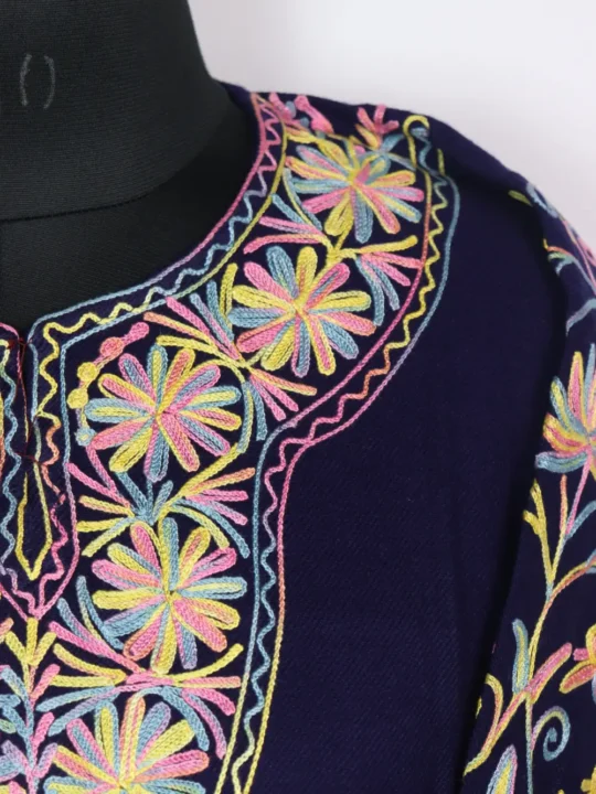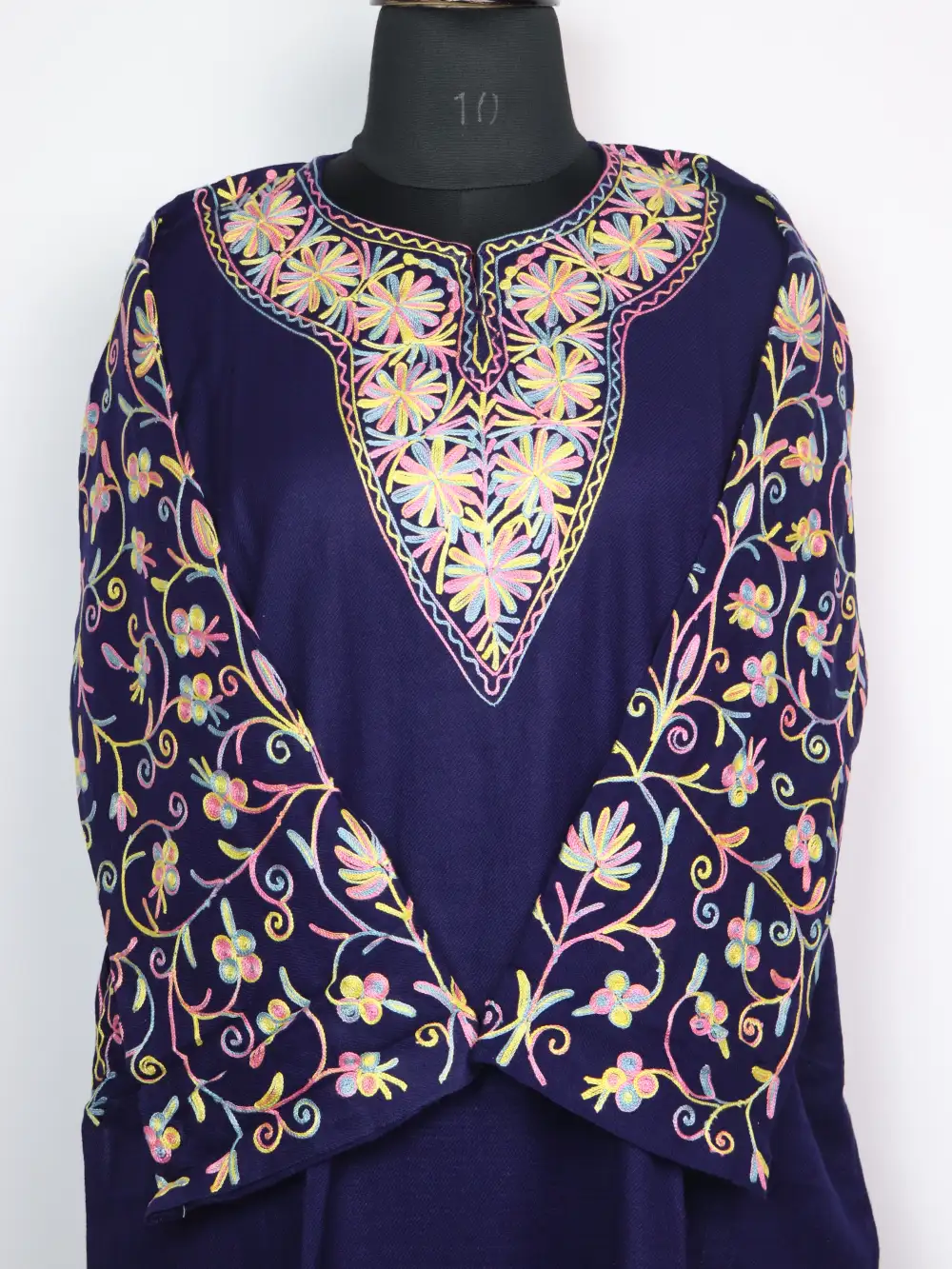 Dark blue Cashmilon wool Kashmiri feran showcases Aari embroidery at the neckline in continuous floral motifs and the sleeves in jaal pattern. Chest size 50 inches and length 42 ensure generous fall.