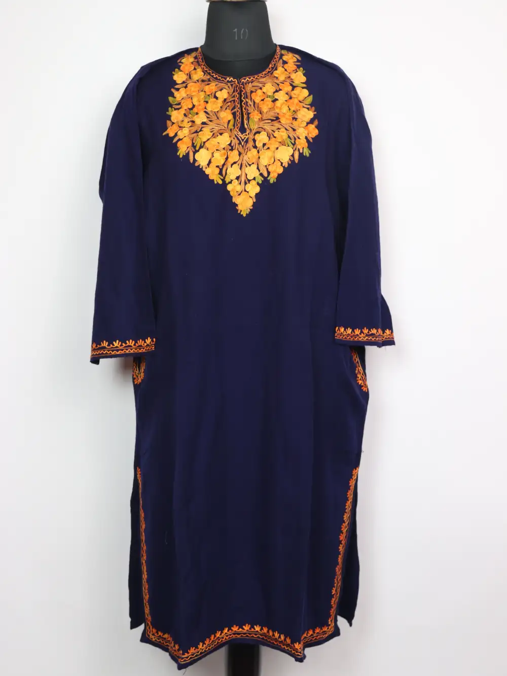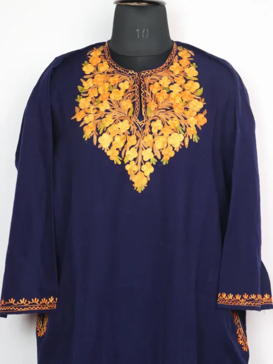 Crafted in Cashmilon wool, this Kashmiri feran pairs useful design with tasteful detailing. It includes pockets both side for daily convenience. Its neckline carries Aari embroidery where floral patterns have been stitched to form a balanced floral band.
