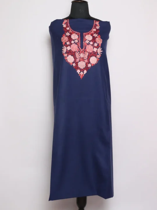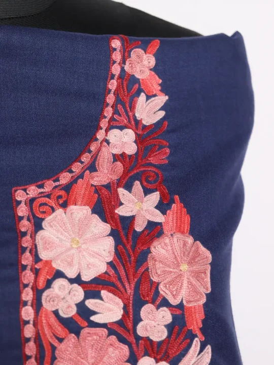 This dark blue unstitched 2pc suit in Ruby cotton lets you design it to your size and taste. It has been highlighted at the neckline, Aari embroidery brings in florals made with pink threads and leafy touches in red, that gives the suit a lively edge. It is light yet durable, the fabric feels gentle and wearable, while the embroidered detail ensures the outfit carries elegance once tailored.