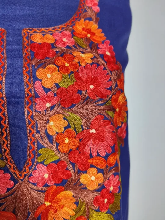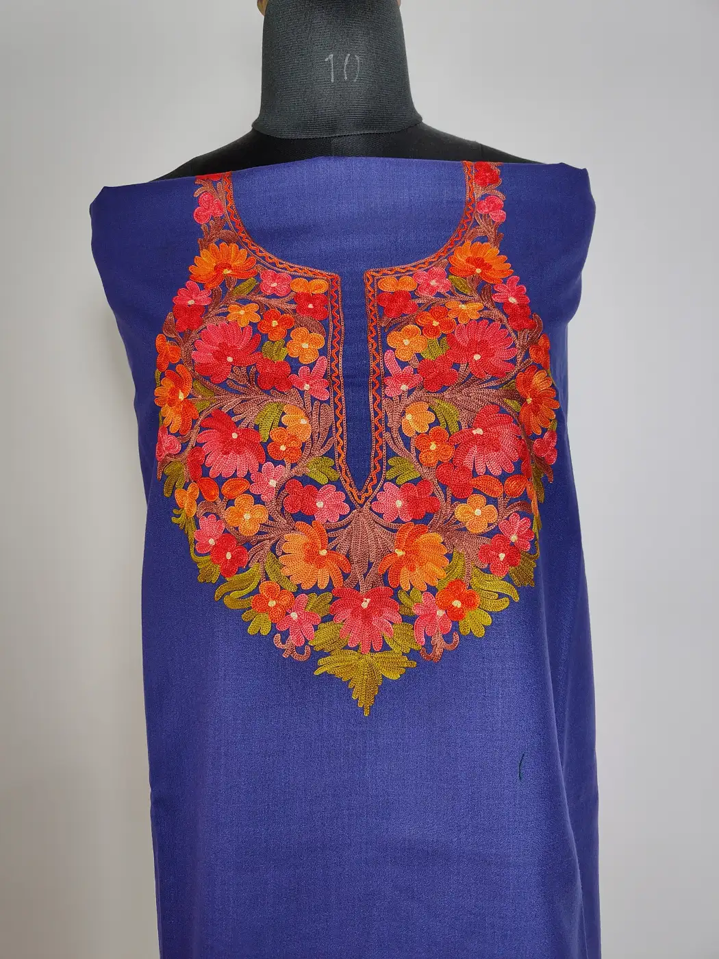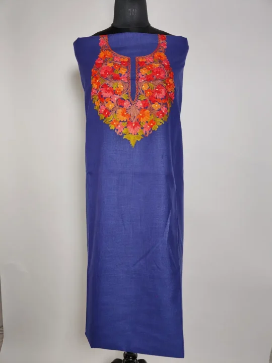 Crafted in dark blue ruby cotton, this suit reflects Kashmiri elegance with unstitched kurti and trouser for custom tailoring. Its floral aari embroidery decorates the neckline gracefully.