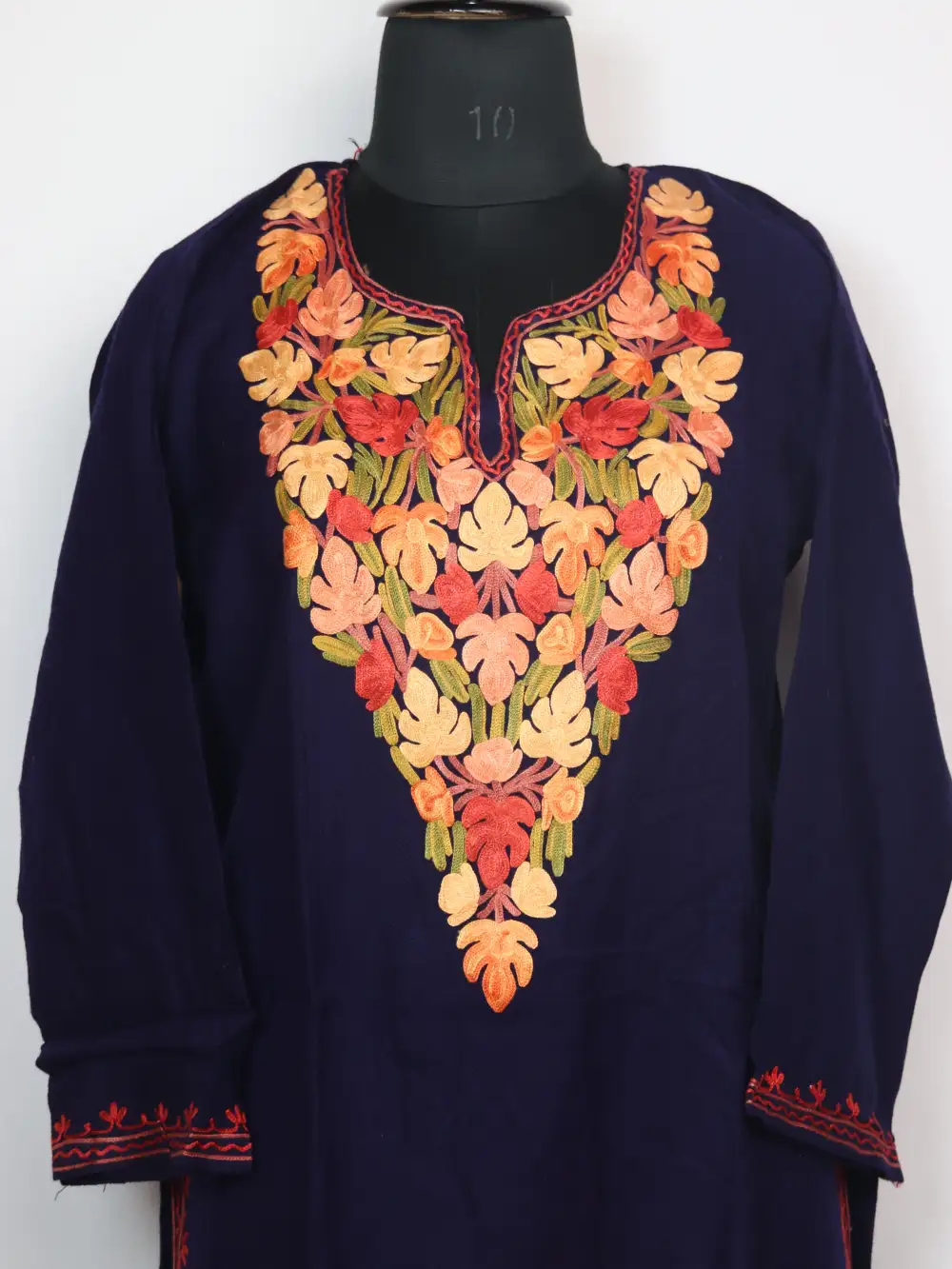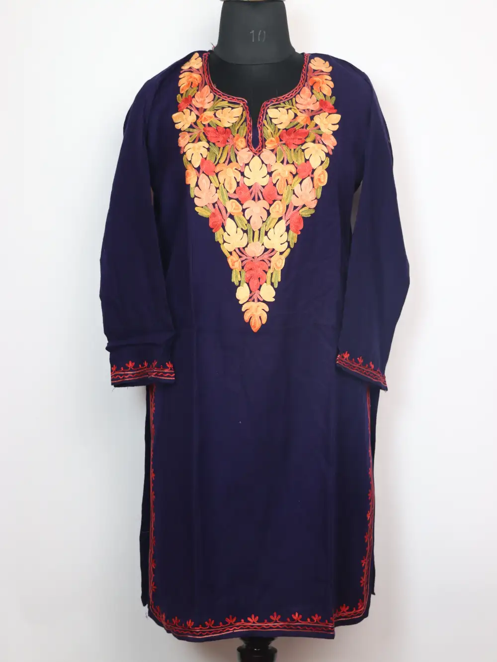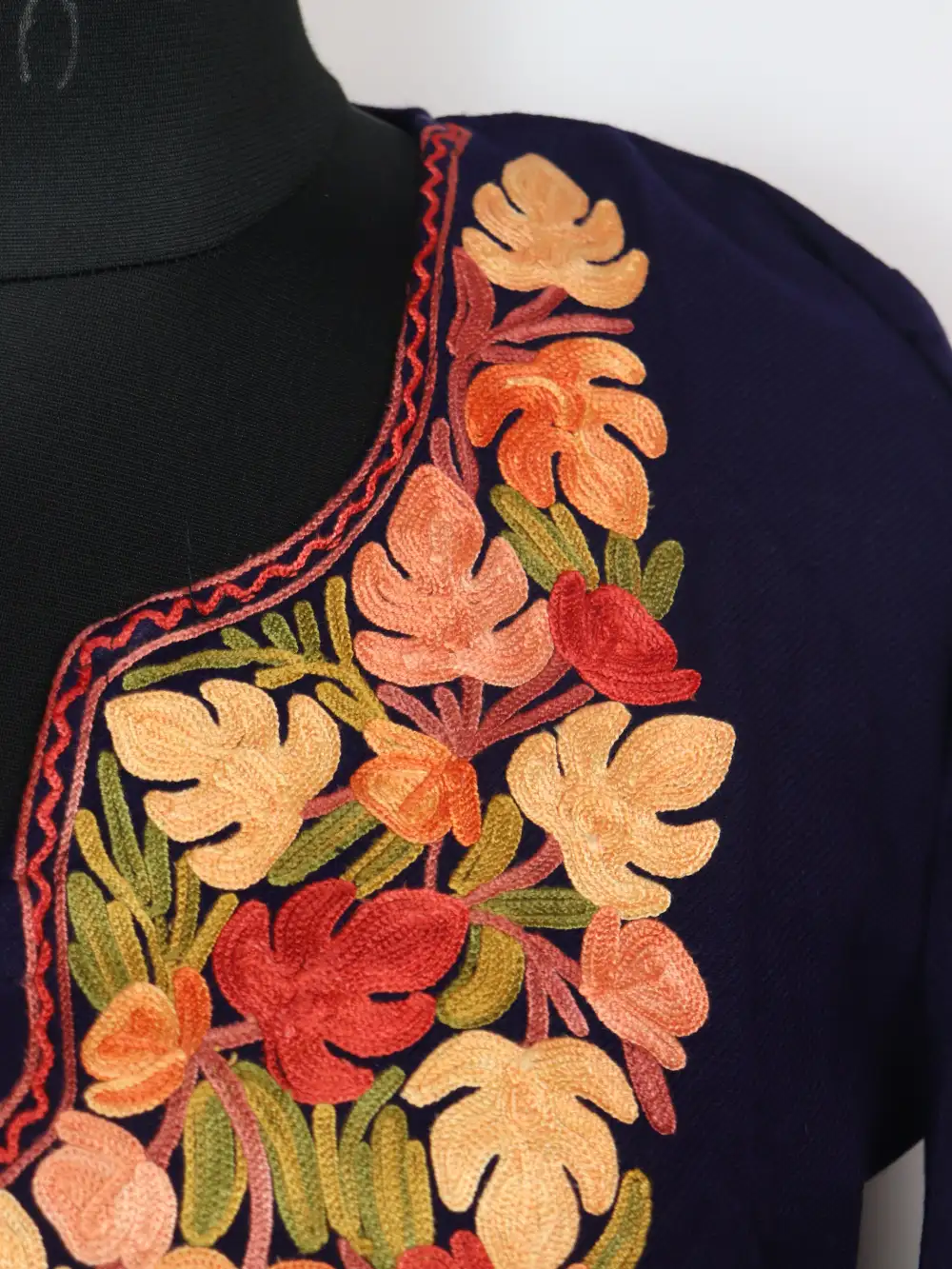 A relaxed long woolen warm kurti in a beautiful Dark Blue color, detailed with chinari aari kadhai across the neckline. This kurti has a smooth fall that is suitable for daily winter use.