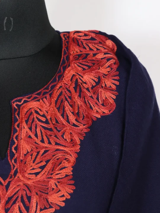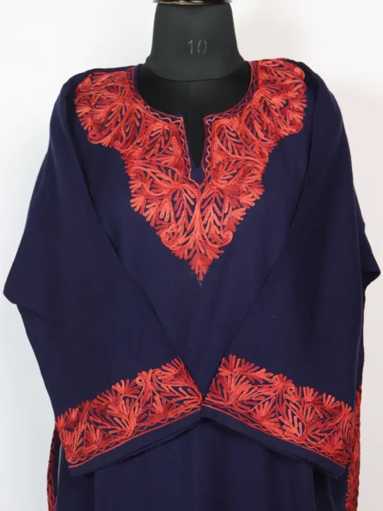 A calm dark blue pheran made in Cashmilon wool with orange Aari badam floral at the neckline and daman, it comes in 51 inch chest size and 44 inch length for a neat winter fall. This pheran pairs well with plain trousers or a shawl and feels both comfortable and refined. You can buy this kashmiri phiran female style online and add this neck and daman-embroidered piece to your seasonal rotation