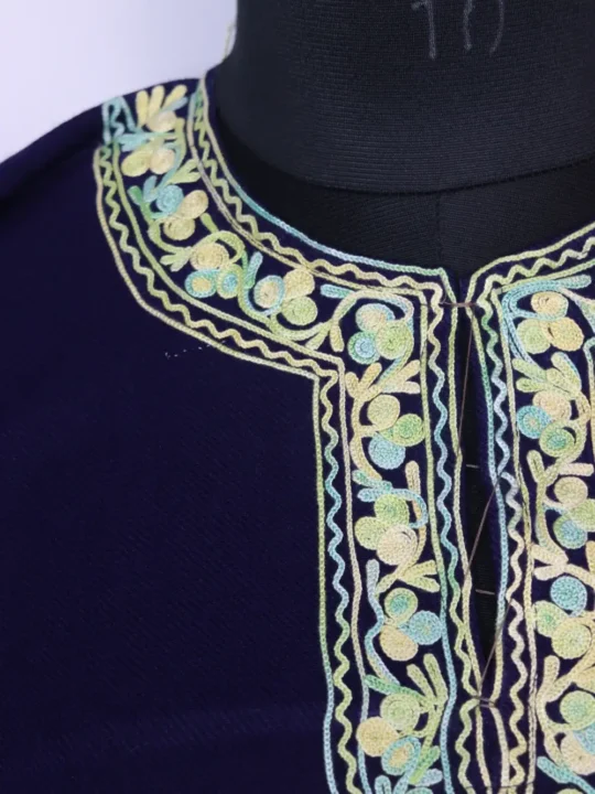 Designed using cashmilon wool to suit cold seasons, this stylish Kashmiri feran appears in dark blue colour. Its floral aari embroidery highlights the neckline and daman gracefully.
