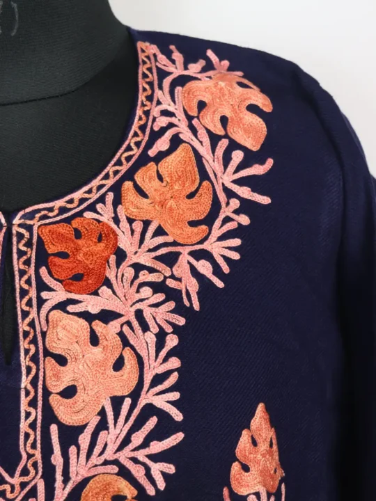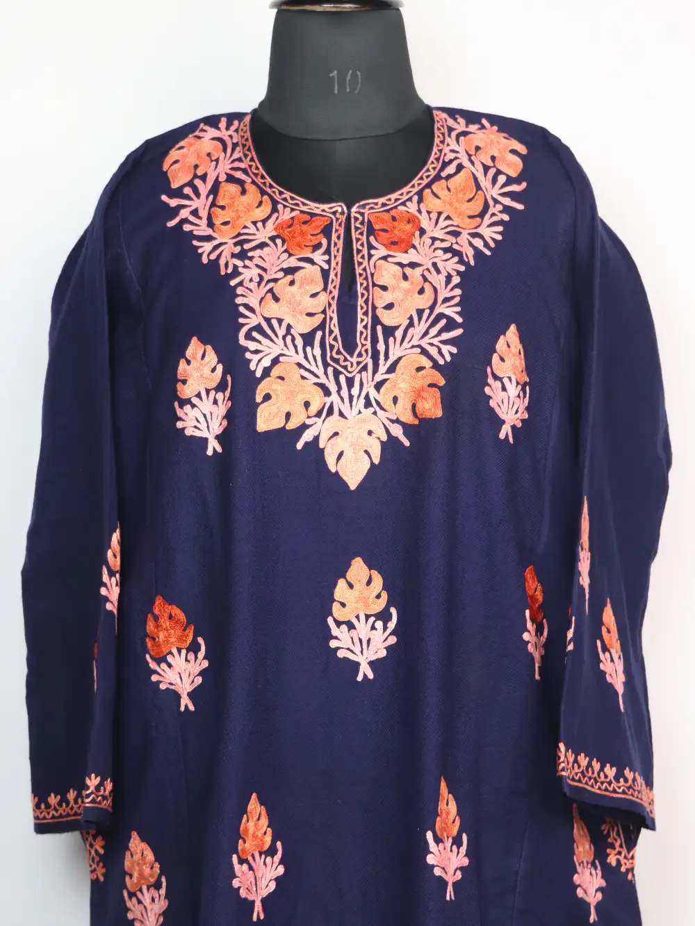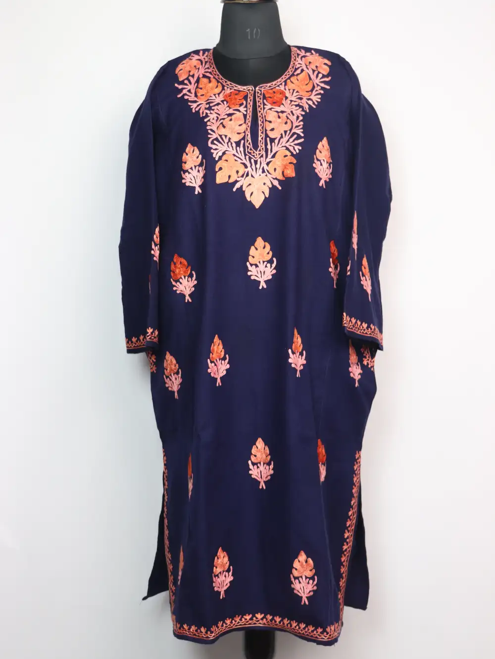 This cashmilon wool feran has chianri aari kadhai around the neckline with bootis spread all over the front, The fabric gives it a warm and elegant everyday look.