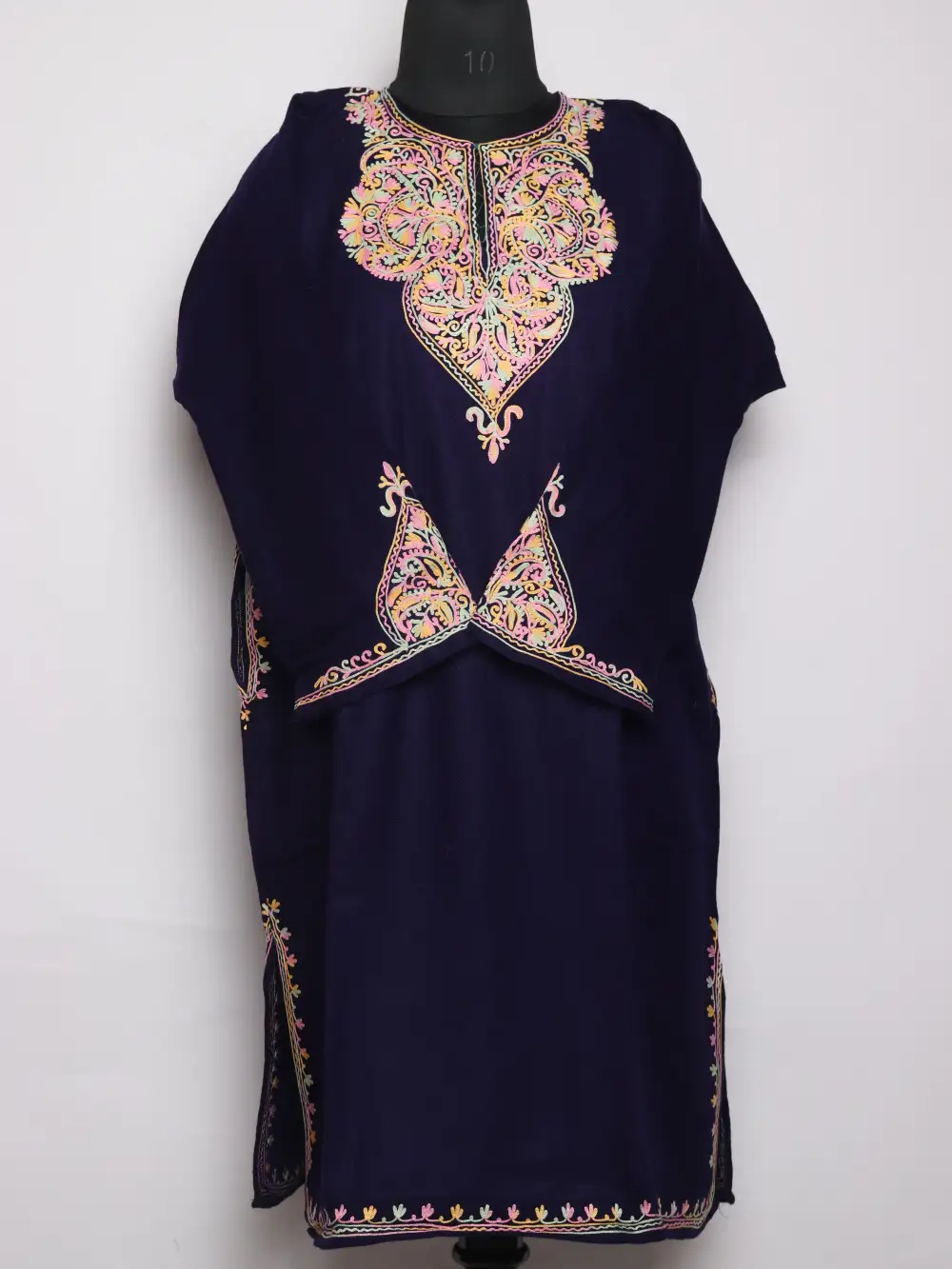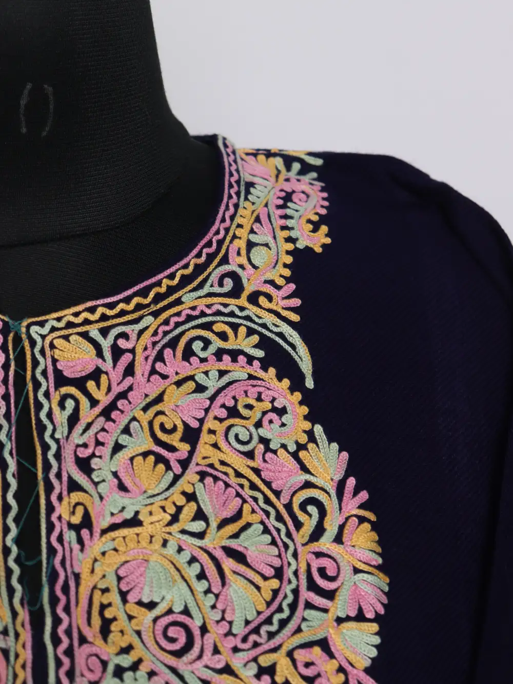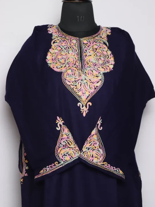 This dark blue colour Kashmiri pheran in Cashmilon Wool shows Aari work at neckline floral patterns around the neckline. It comes with chest size 42 inches and length 40 which give it a comfortable and layered fit.