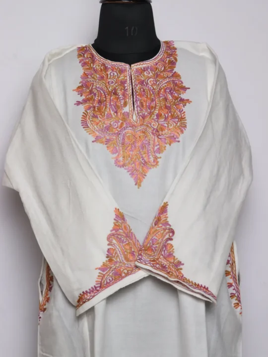 White Cashmilon Wool and Aari style embroidery around the neckline and end of sleeves in floral motifs create a calm look on this Kashmiri phiran, Chest size46 inch and length 43 inch gives a roomy, graceful fall.
