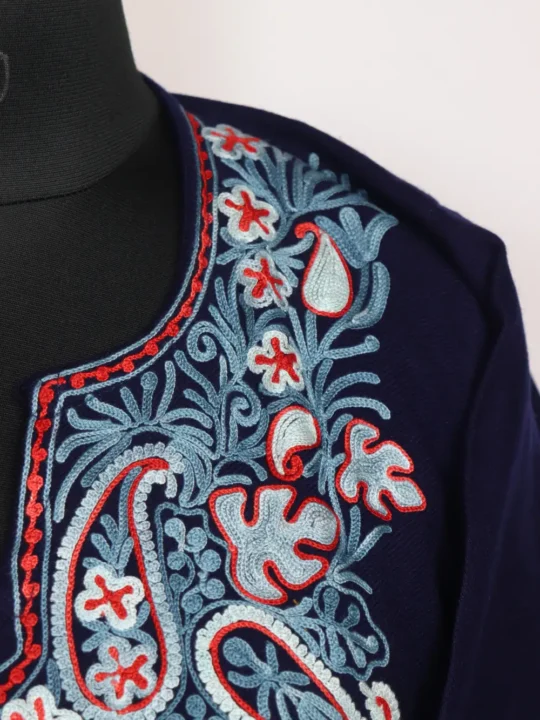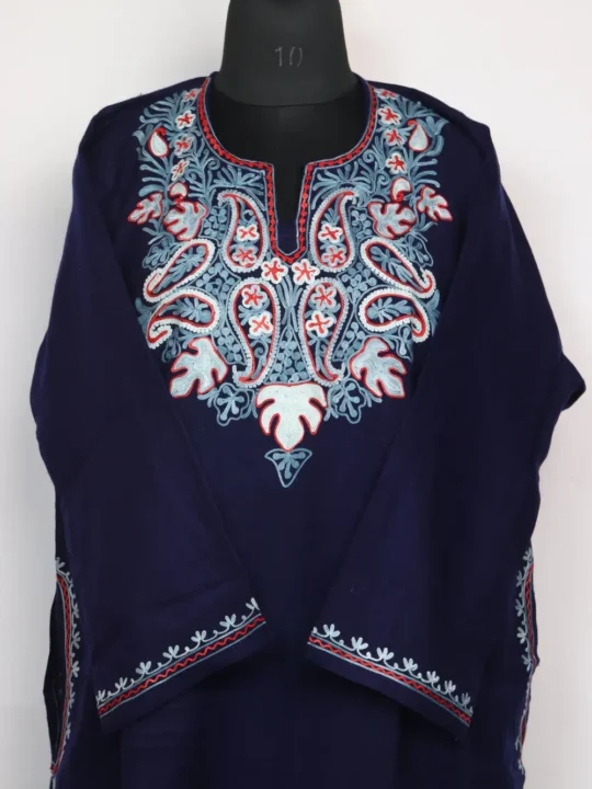 Dark blue premium Cashmilon Wool and Aari style embroidery around the neckline in badam motifs create a calm look on this Kashmiri phiran, Chest size 50 and length 43 give a roomy, graceful fall. This phiran from kashmir offers understated warmth.