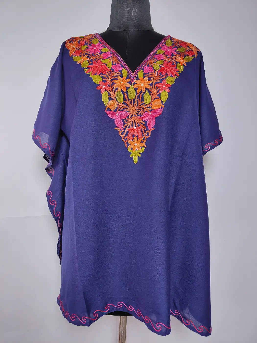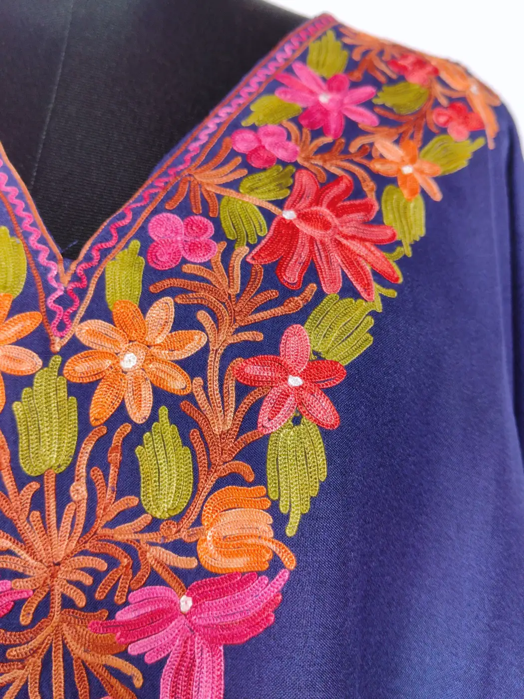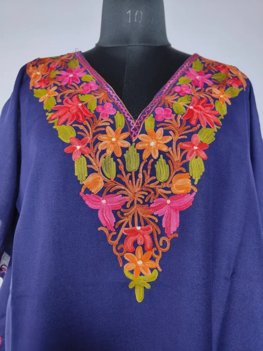 This Aari work Kashmiri kaftan is designed in dark blue summer cool cotton brings together comfort and detail. The neckline carries floral embroidery that draws attention softly. It feels easy, flowing, and naturally suited for relaxed traditional styling.