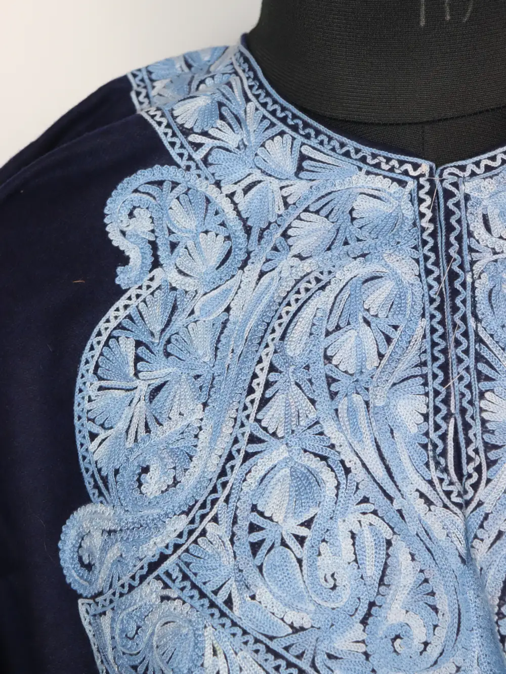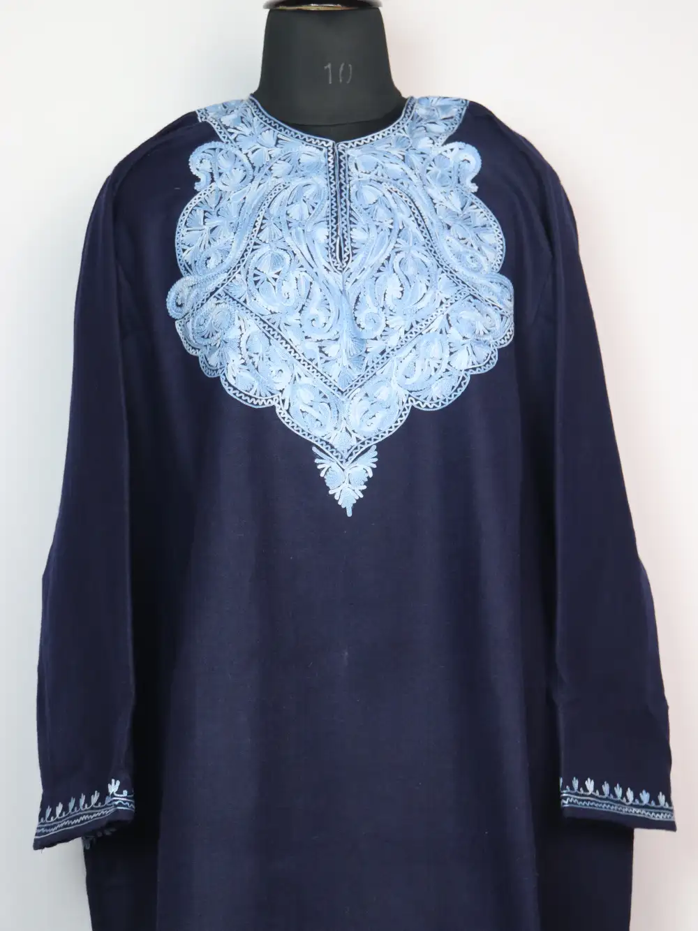 Warm tweed paired with a graceful floral and badam kadhai embroidery neckline makes this pheran easy to style for winter days.