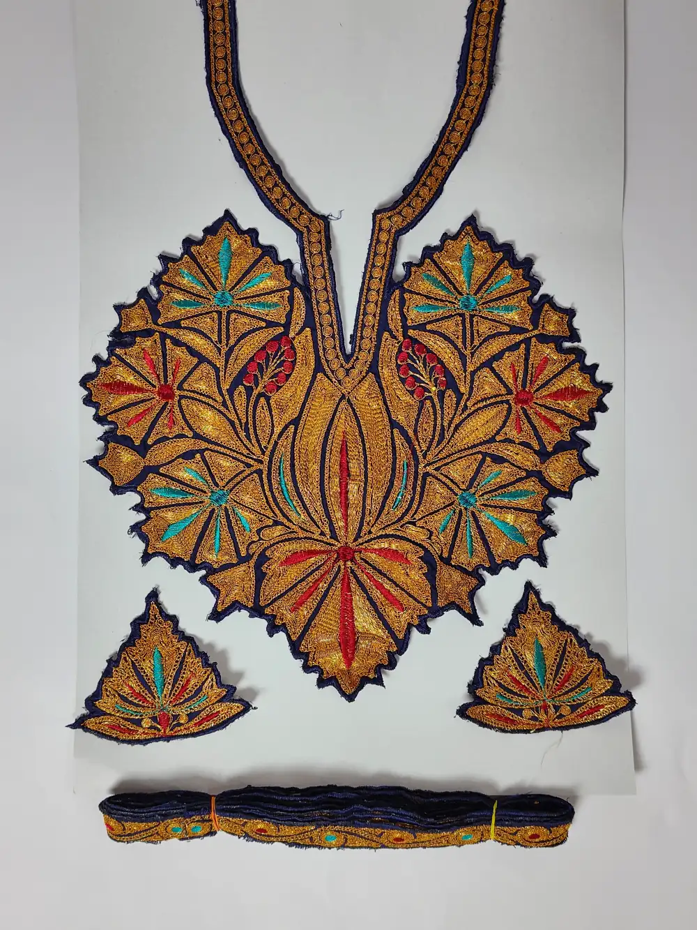 Dark blue toned patches detailed with tilla embroidery represent Kashmiri craft traditions. This chinar shaped patch is suitable for decorating pherans, kurtis, or casual shirts.