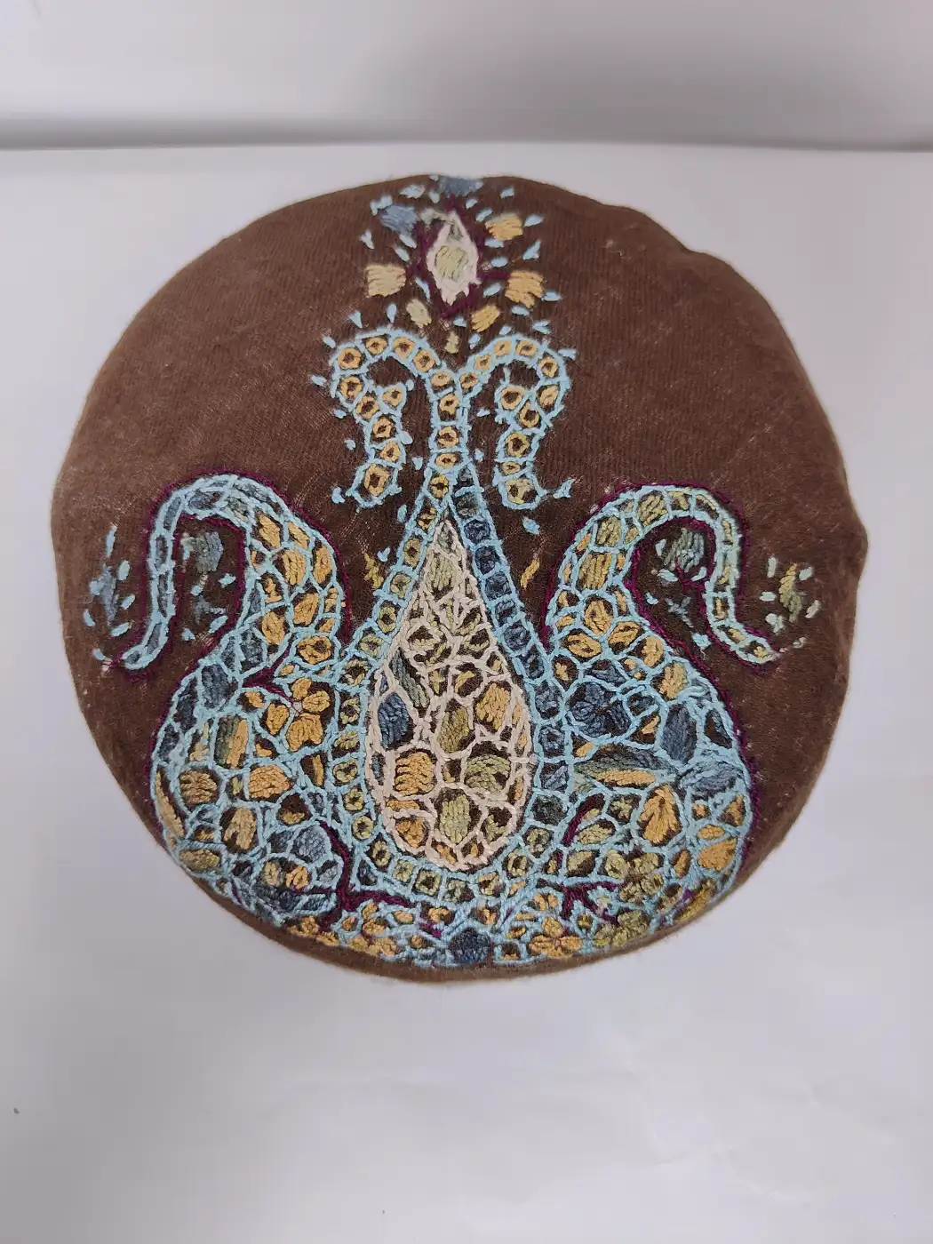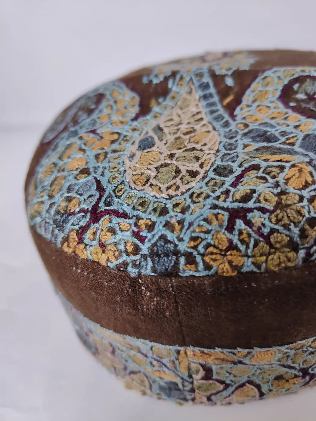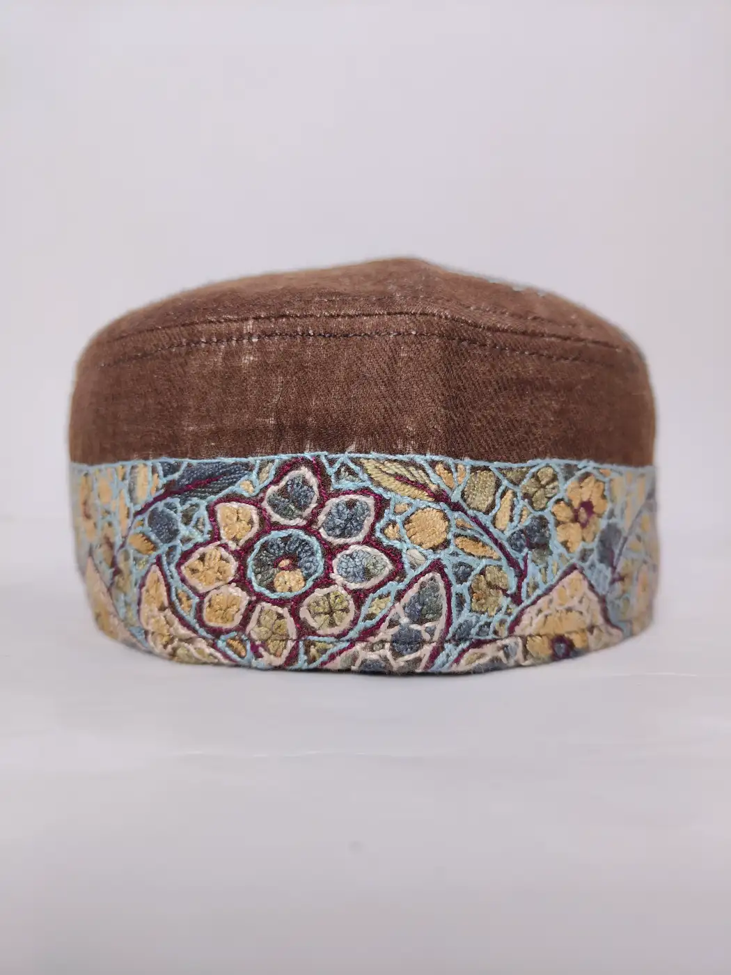 Elegance appears quietly in this MP pashmina classic cap in dark brown hue which is crafted with delicate hand sozni embroidery. The crown carries a graceful almond shaped motif that is filled with intricate floral patterns. Along the sides runs a detailed band of embroidered blossoms arranged closely together which makes a decorative border that reflects the richness of Kashmiri artistry.