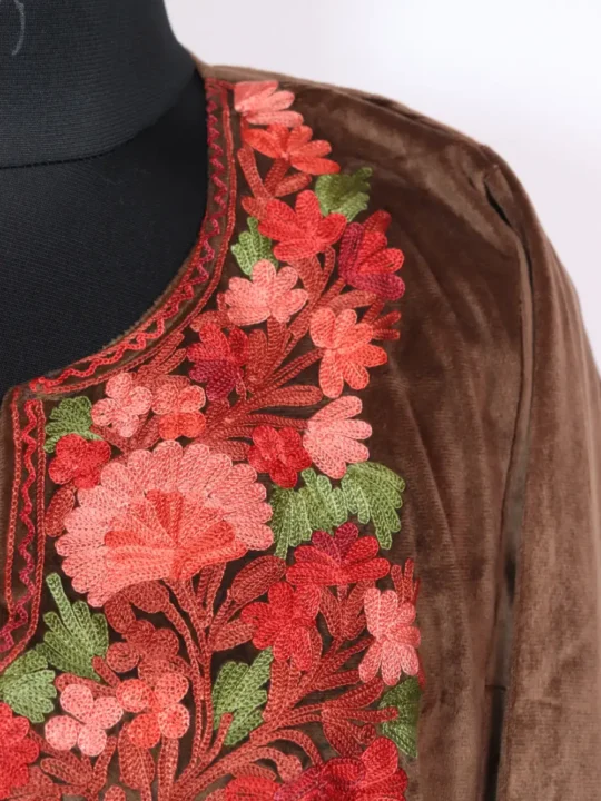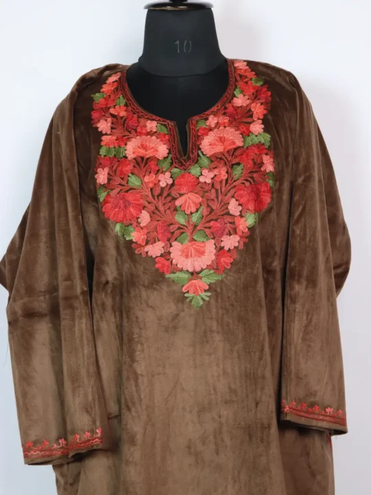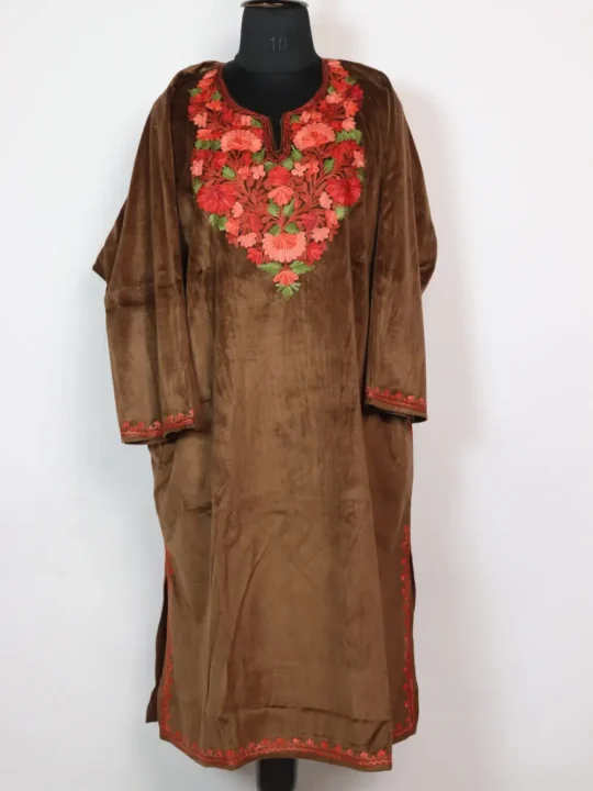 This brown velvet pheran carries floral Aari embroidery at the neckline and measures 58 inch chest size and 42 inch length, it is a calm, plush choice when you want elegant Kashmiri kadhai.