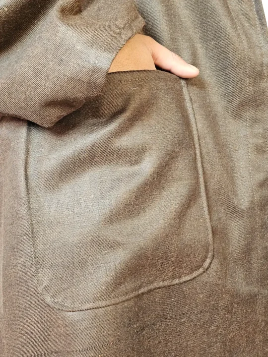 Made in Tweed wool, this dark brown gown features pockets on both sides on front panel and roomy chest size 56 with length 47 inches for graceful fall and easy layering through winter evenings always.