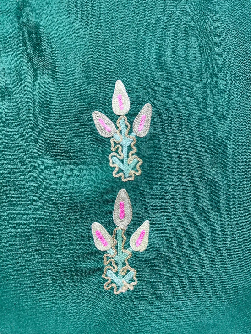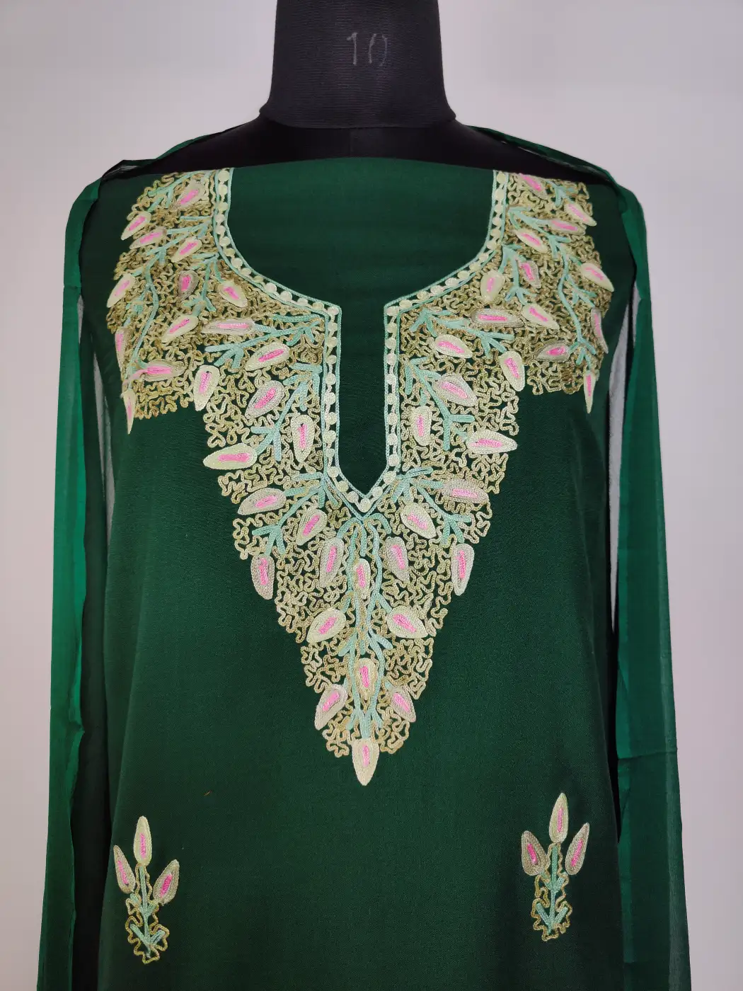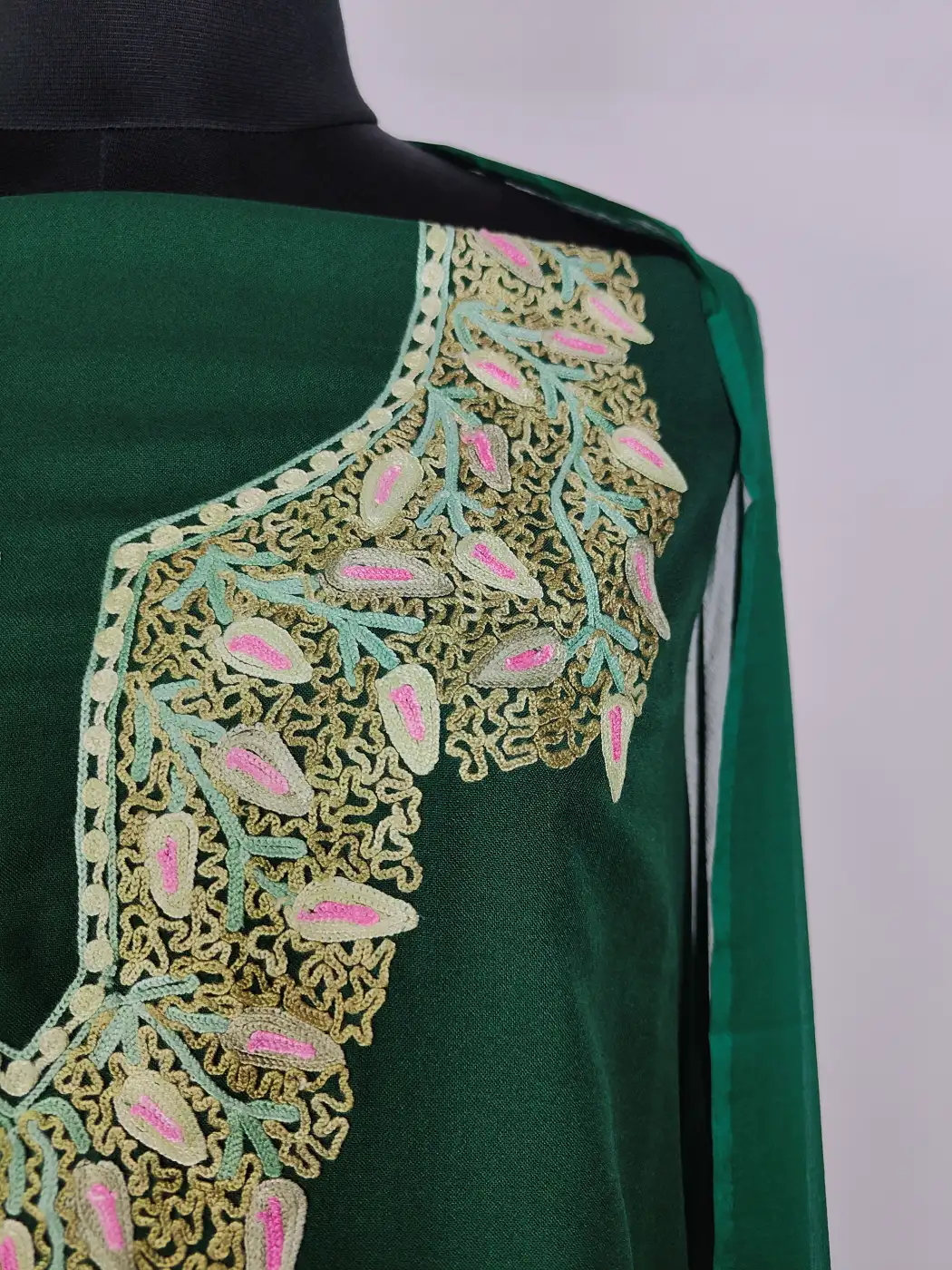 Shaped in summer cool cotton for pleasant weather. This dark green colour kashmiri suit set presents Kashmiri aari embroidery in bootis all over it and at neckline in floral motifs. It stays unstitched so you can tailor it according to your own fit.