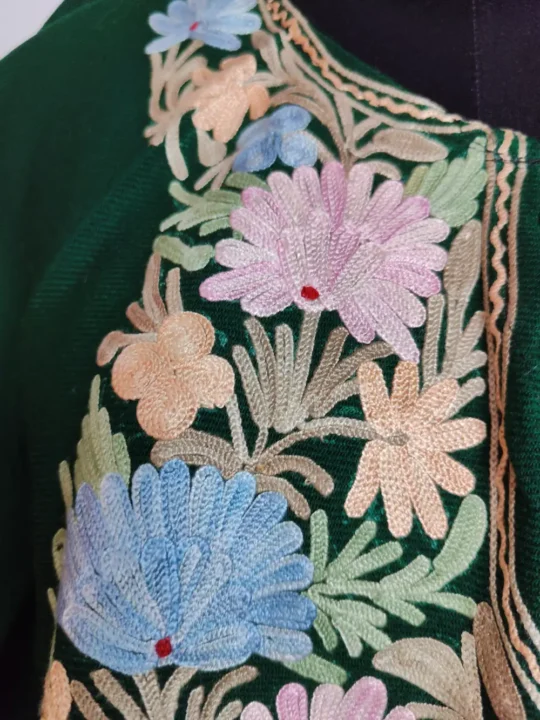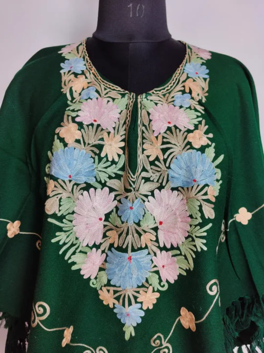 Cashmilon wool forms this dark green kashmiri poncho online adorned with floral Aari at the neckline and a continuous motifs near-border motif. Side-by-side, it is 58 inches and its length is 28 inches.