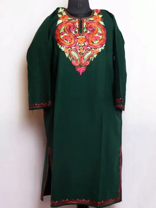 This green Cashmilon pheran is the sign of elegance It is designed to keep you warm during the winter season. Its delicate Aari embroidery adds an intricate touch, making the pheran stand out. The soft, luxurious fabric ensures comfort, while the beautiful embroidery elevates your look, perfect for both casual and formal occasions
