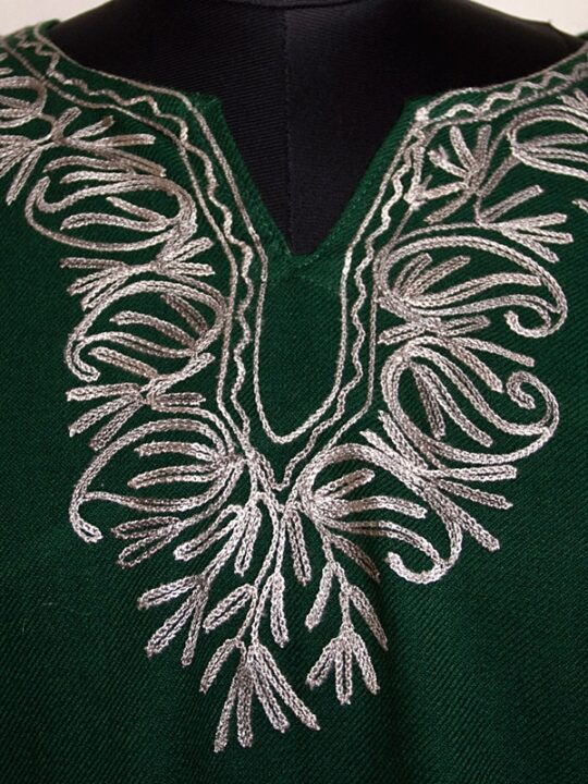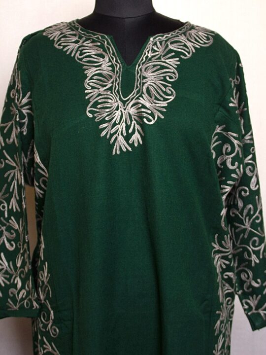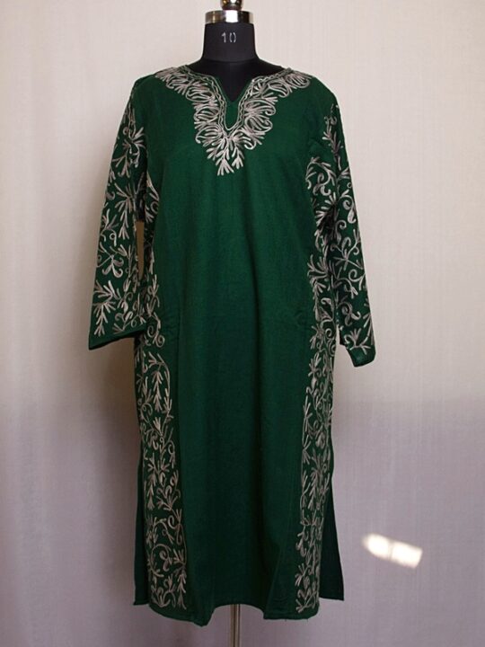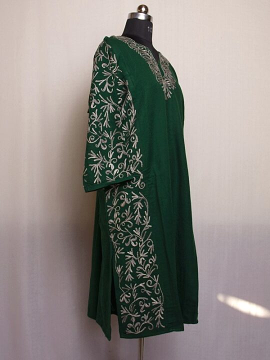 Dark Green Cashmilon Sidepanel Pheran with Beautiful Aari