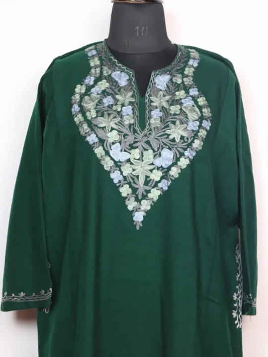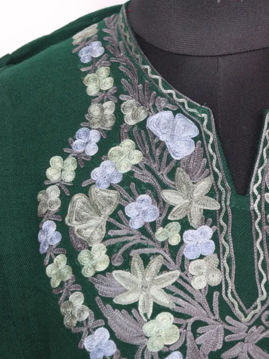 Made from cashmilon wool for cold seasons, this Kashmiri dress faran comes in dark green colour. It emphasizes floral aari embroidery at neckline.
