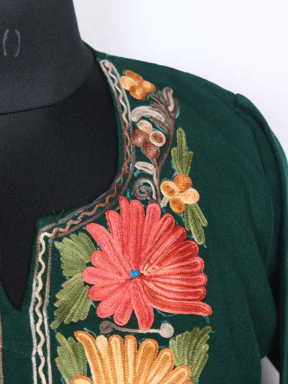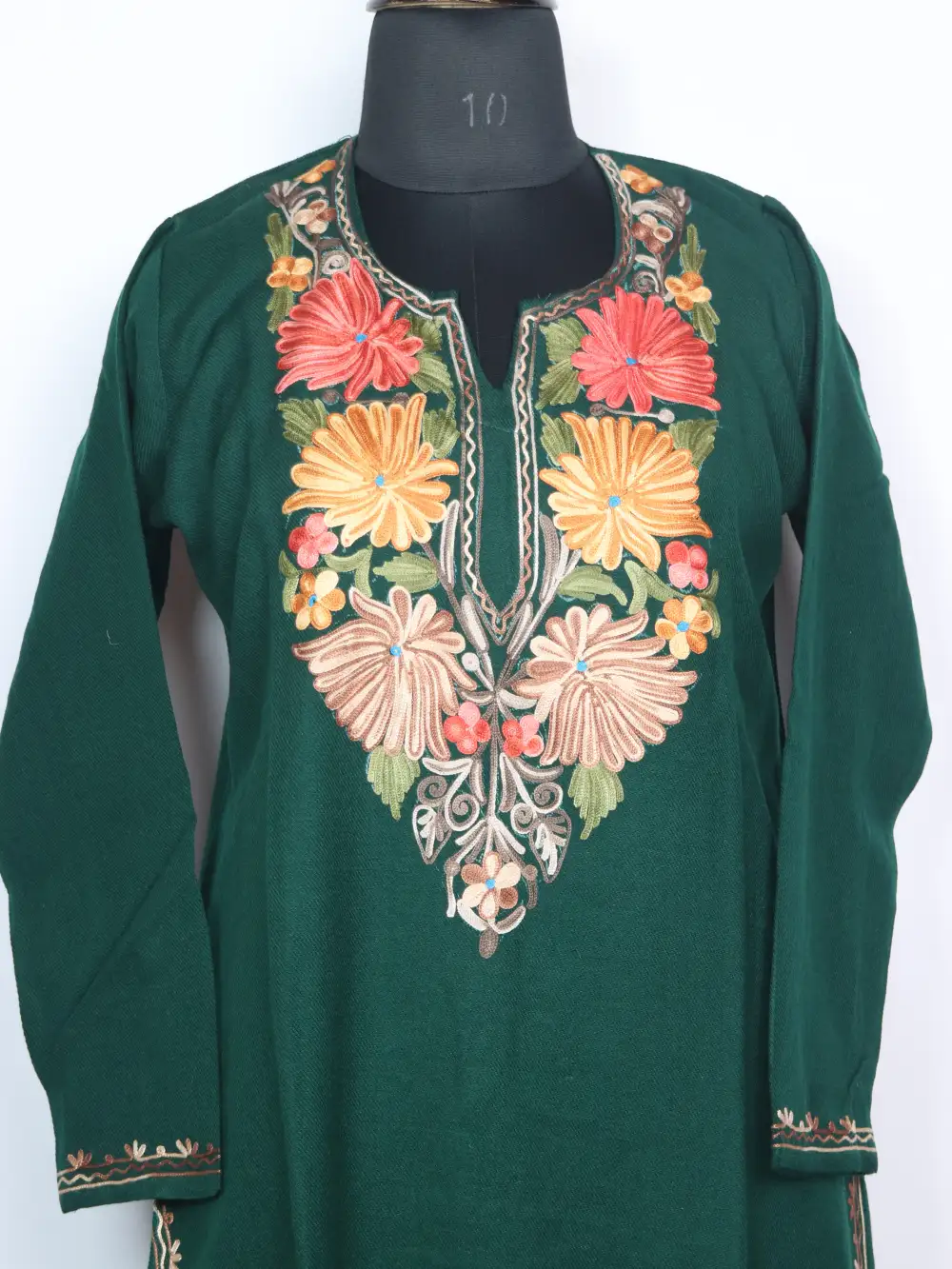 The kurti pant set combines a relaxed kurti and matching trouser in dark green Cashmilon wool for comfortable layering. Aari embroidery shapes the neckline with floral motifs which are are stitched precisely. It comes in chest size 41 inches and length 43 offer an easy fit.