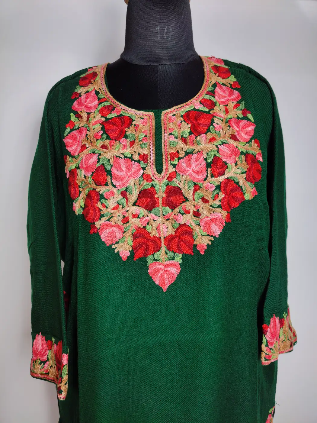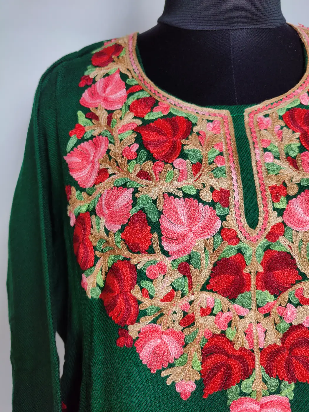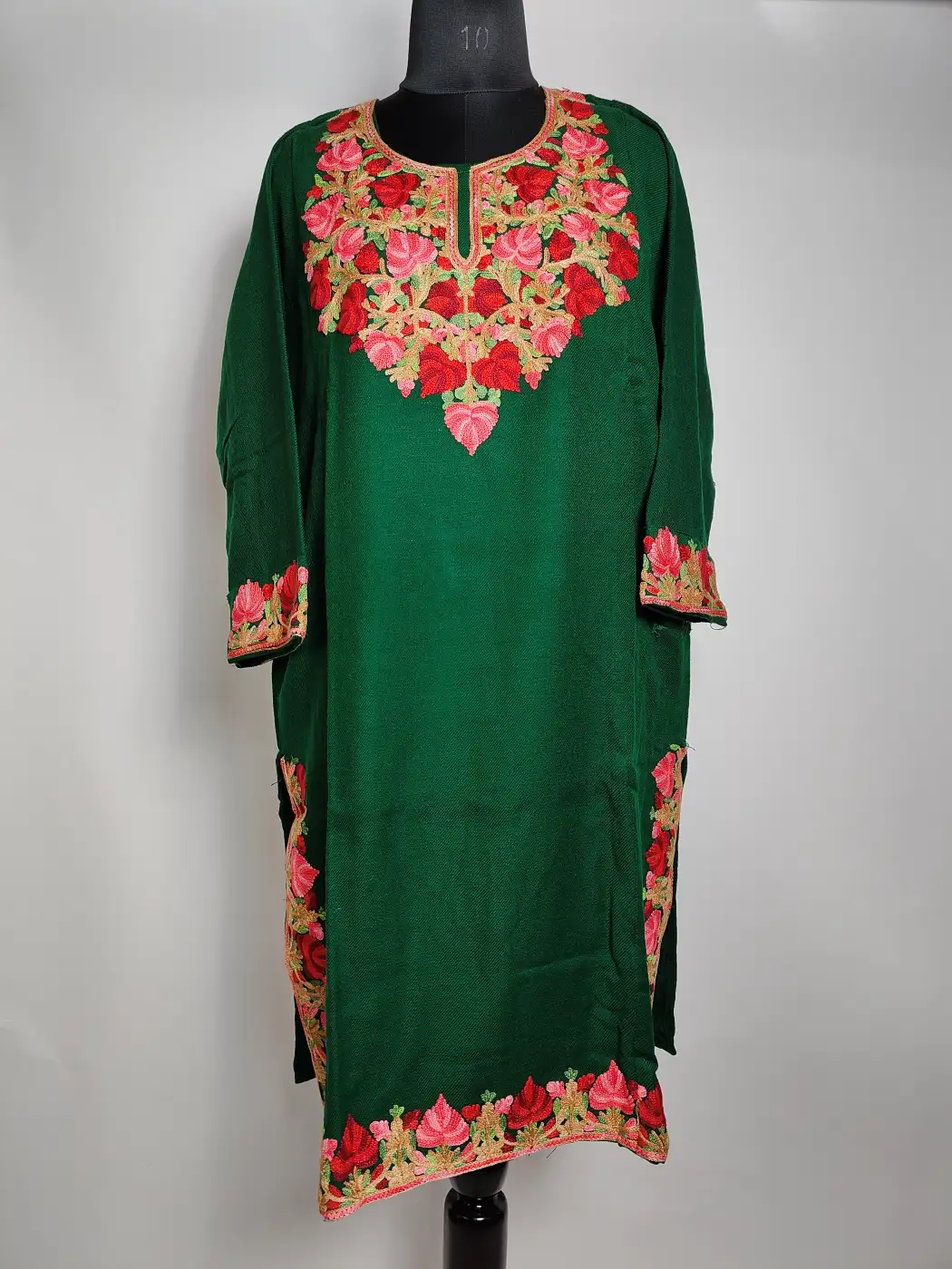 Soft dark green cashmilon wool defines phiran with Kashmiri elegance. It is adorned by floral aari embroidery on neckline, sleeves and border.