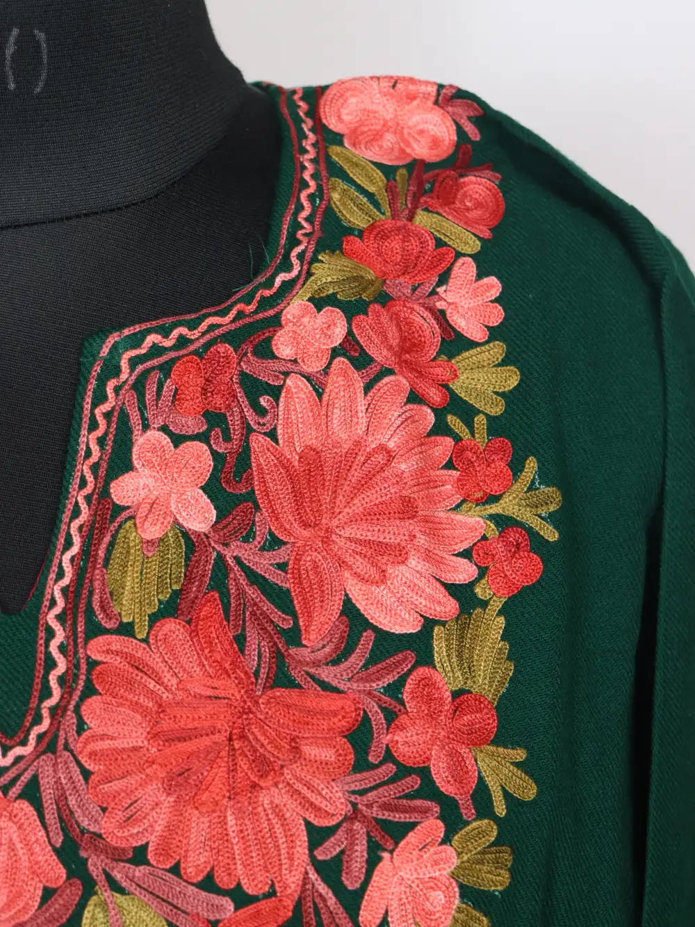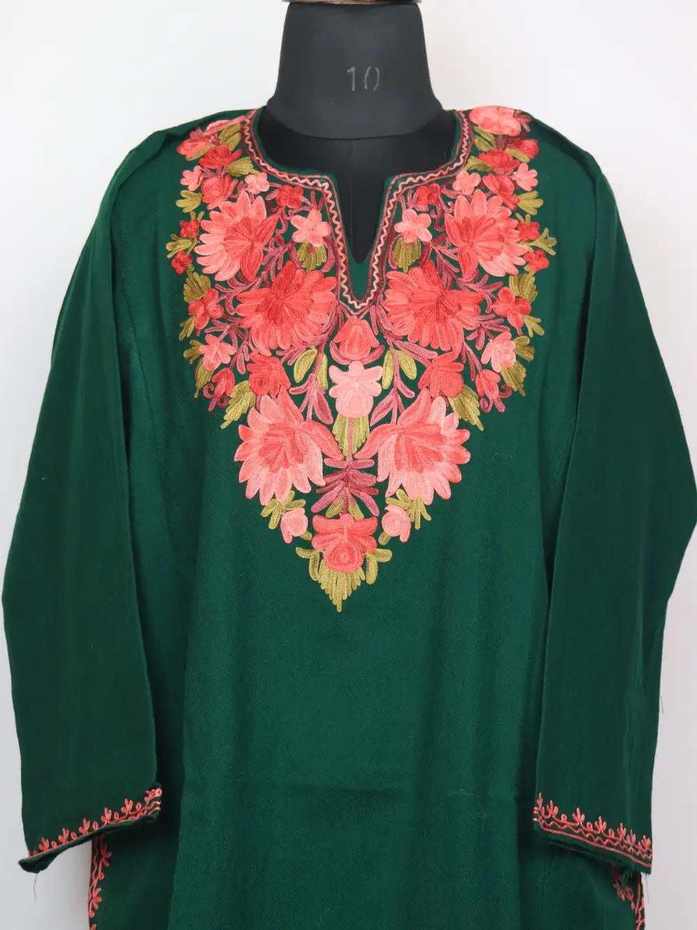 Elegant dark green colour faran kashmiri fashioned in cashmilon wool features Aari embroidery at the neckline in floral motifs and it includes pockets on both sides add discreet utility.
