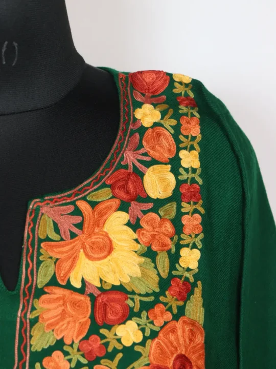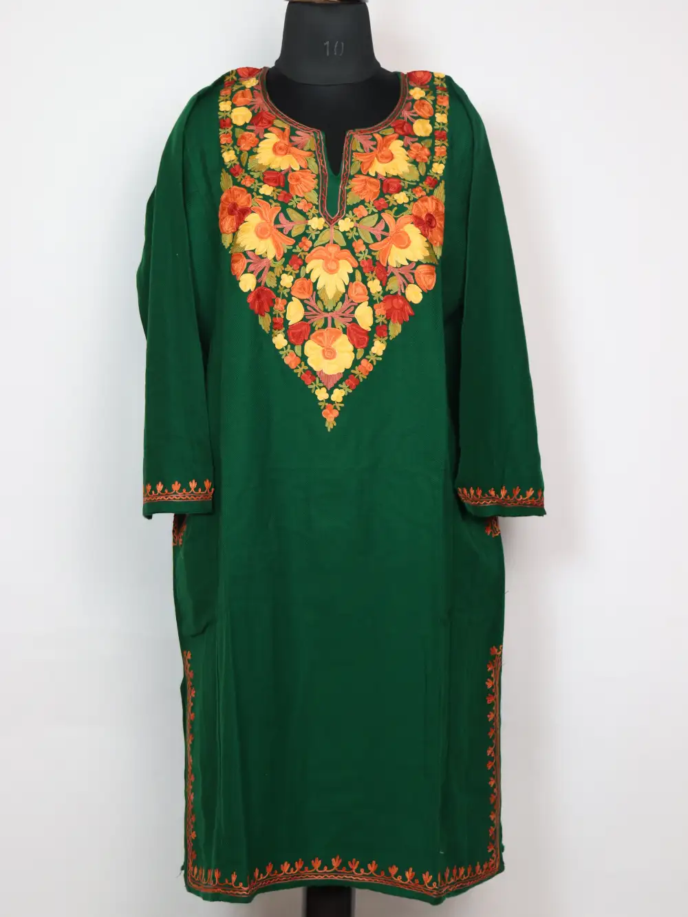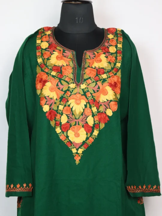 Made for females this Cashmilon wool Kashmiri phiran in dark green features Aari kadhai at the neckline in floral motifs. It comes with chest size 47 inches and length 42 inches which ensure a relaxed, flowing fit.