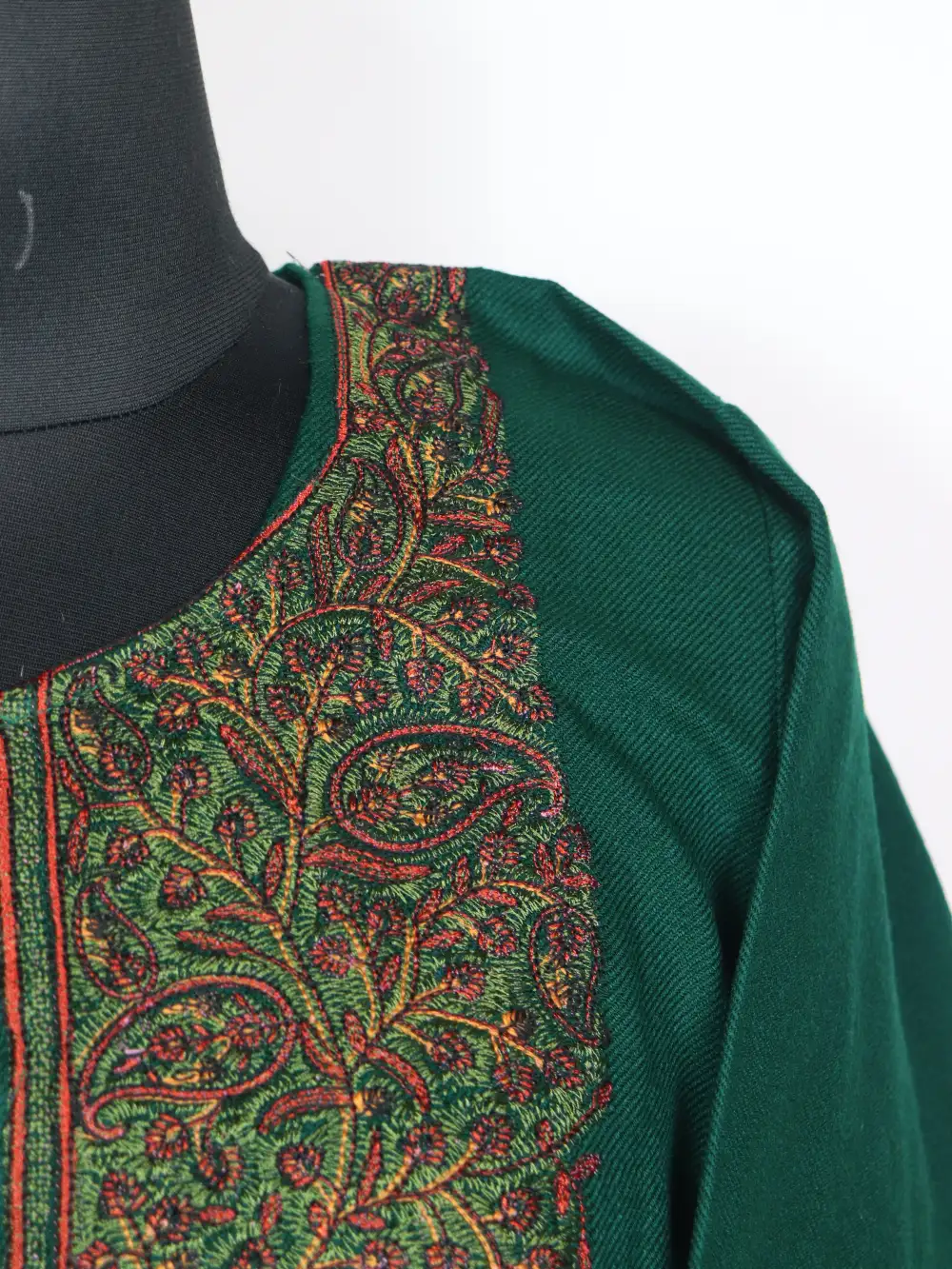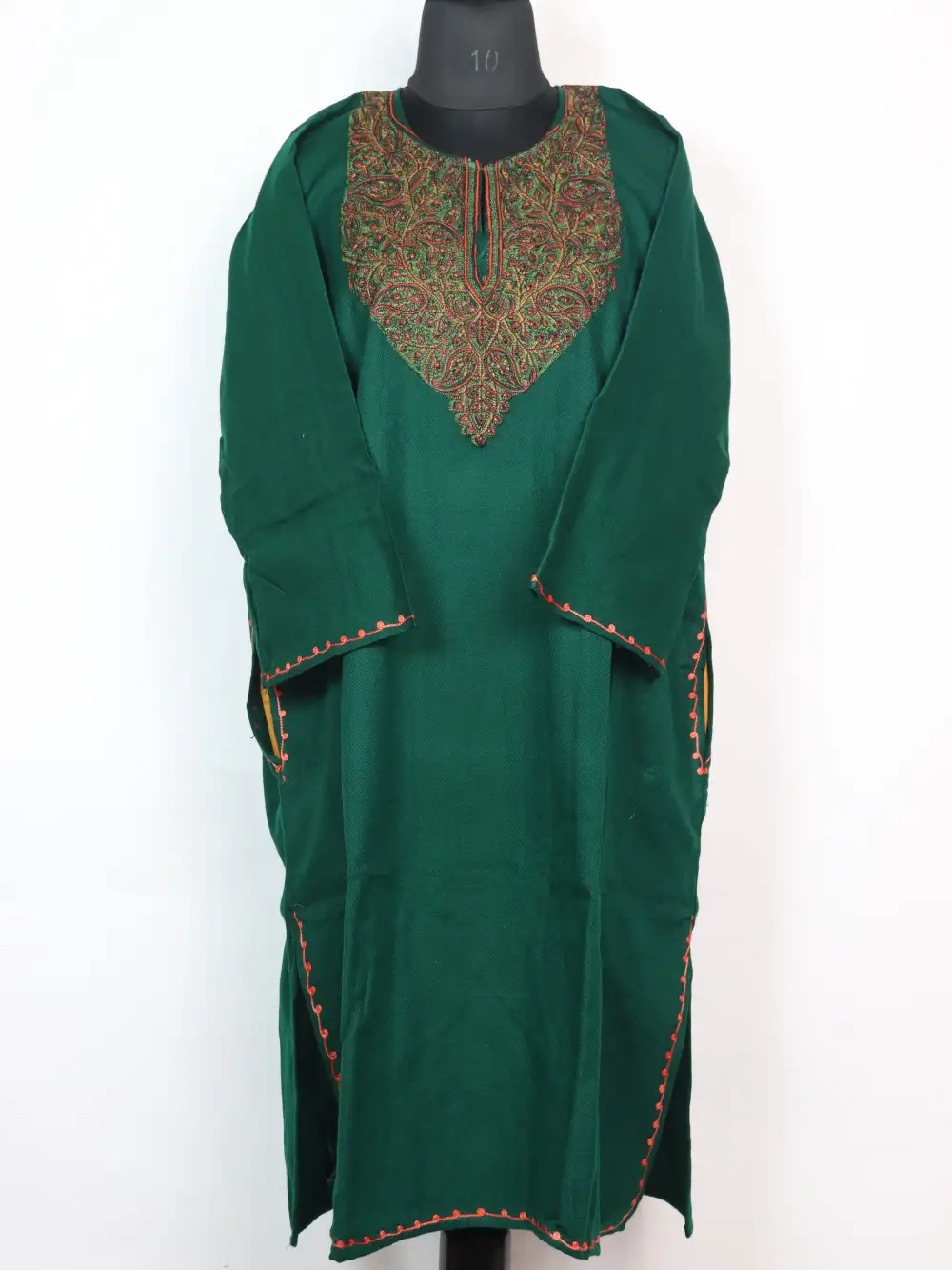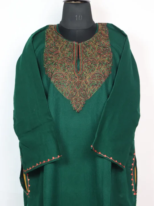 A dark green stylish Kashmiri pheran made in Cashmilon wool, decorated with flowing Sozni embroidery at the neckline. It comes with pockets on both sides for everyday ease.