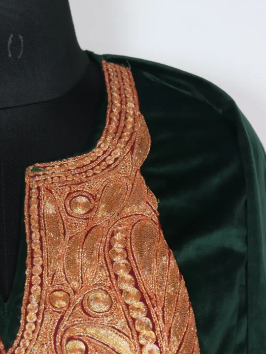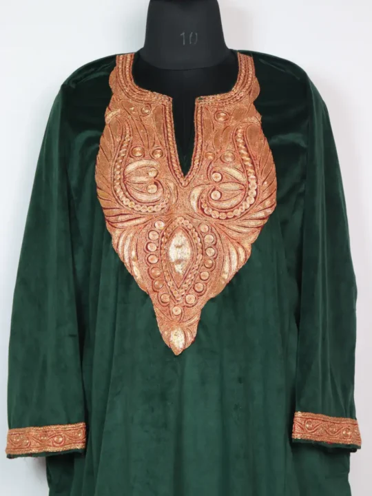 Cut from Velvet, the kashmiri pheran in dark green carries Botte Tilla at the neckline in curved patterns. It comes with chest size 54 inches and length 44 inches which ensure comfortable layer with graceful fall. It is lovely choice for wedding wear evenings.