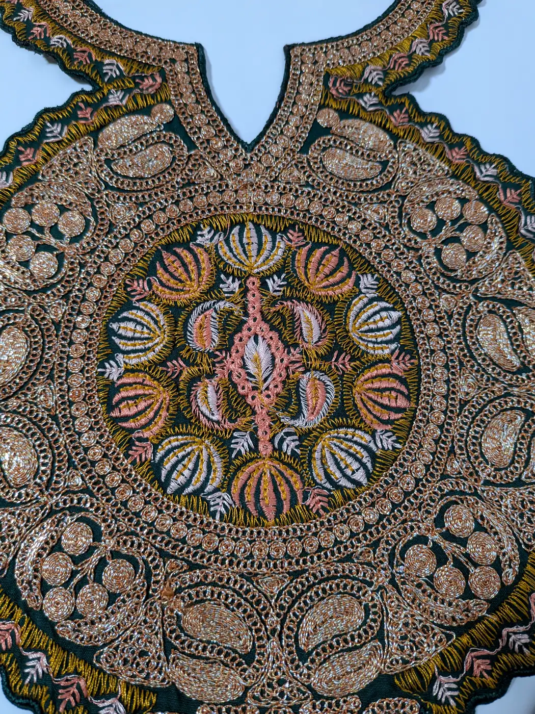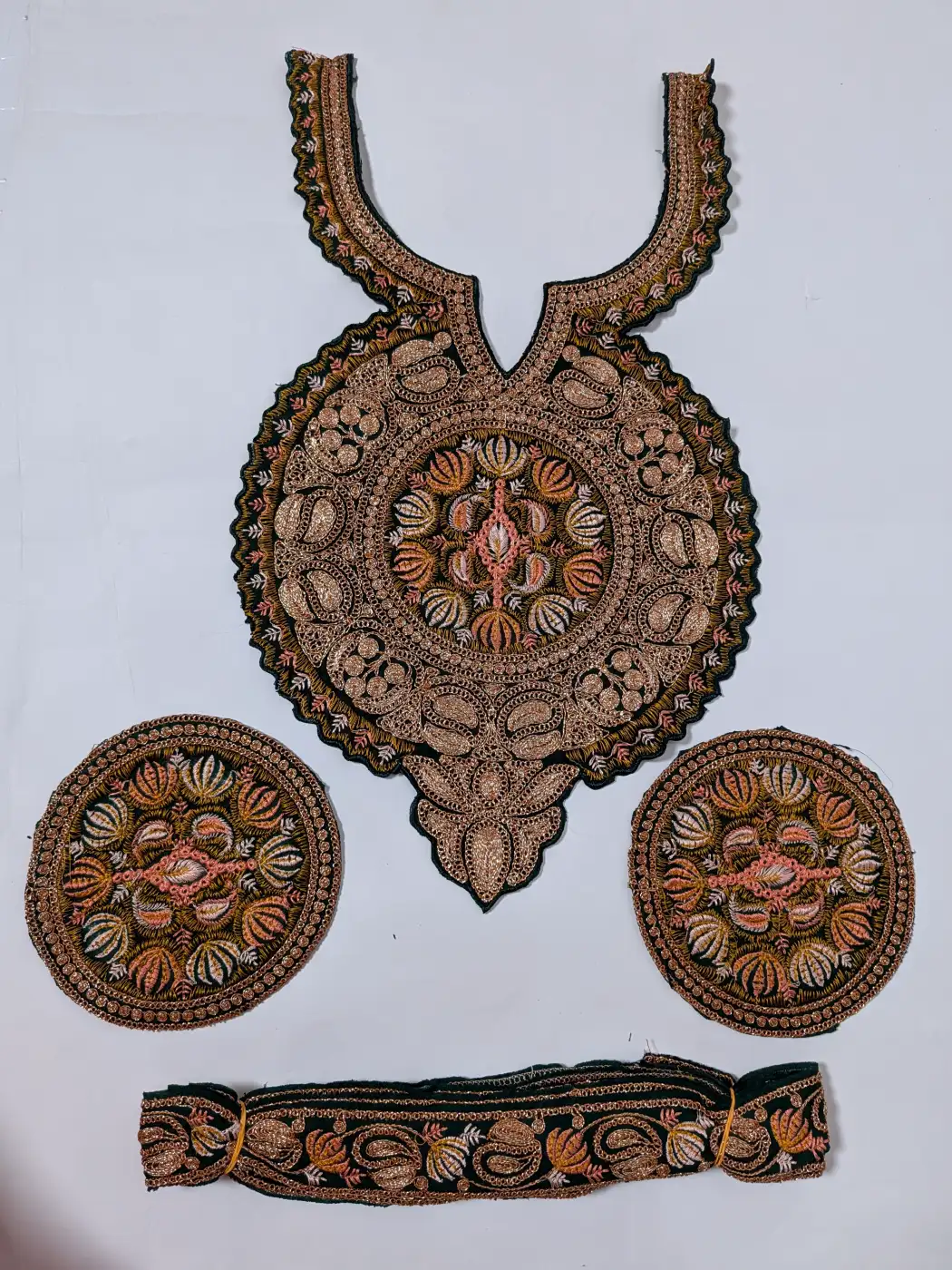 This dark green patch set features tilla embroidery across its elements, with floral and badam designs inside round shape placed on the neck patch and sleeve patches. The lace carries continuous embroidery, and the red base enhances the richness, making the patch set feel traditionally elegant and complete.