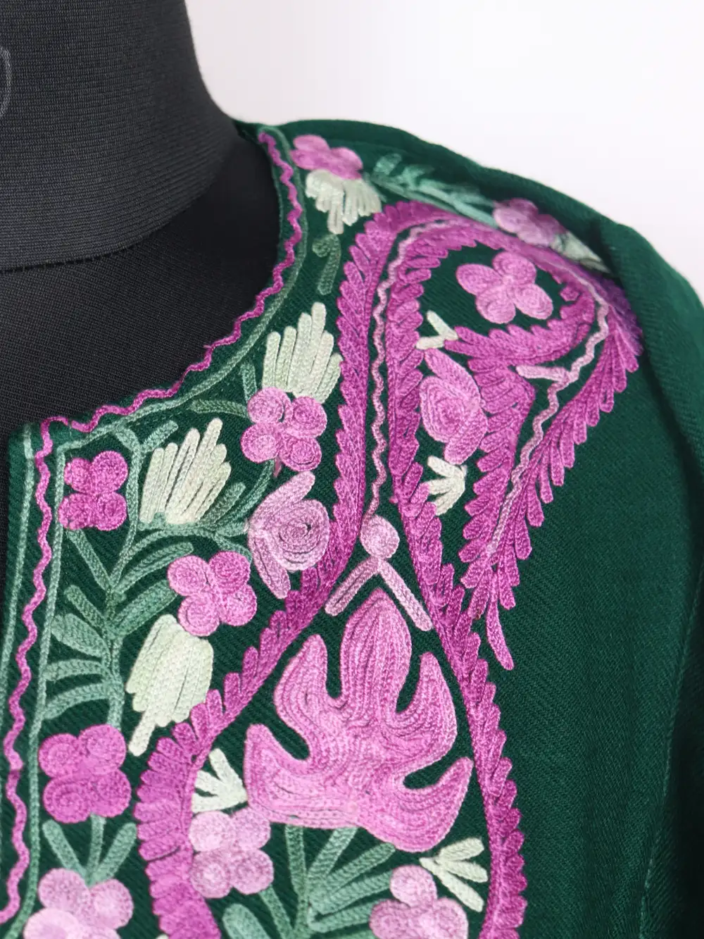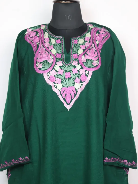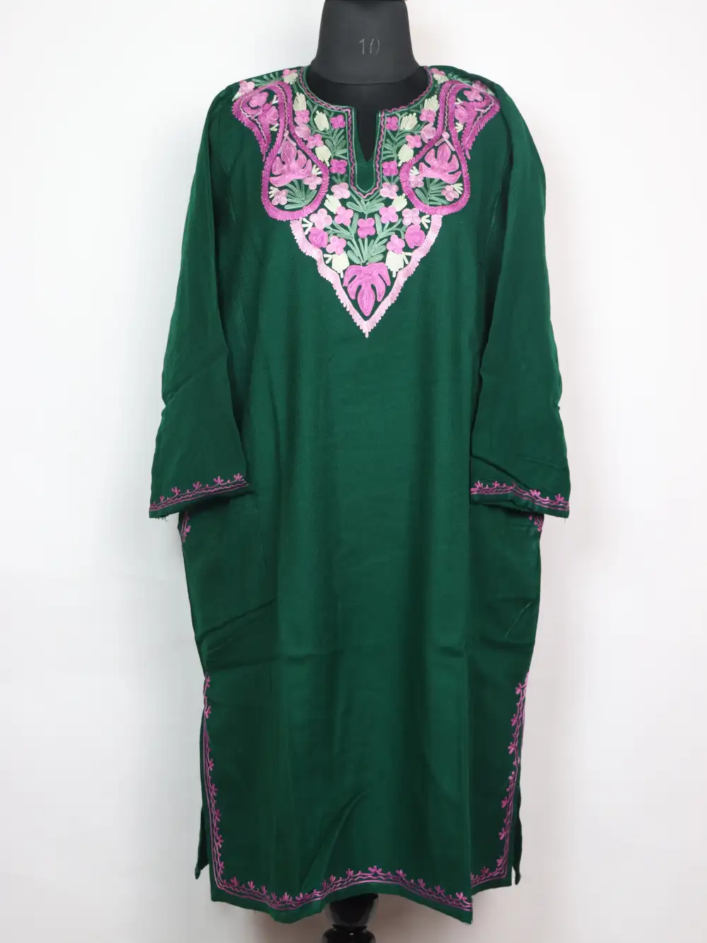 Kashmiri phiran crafted from Cashmilon wool, this dark green piece is decorated with Aari embroidery in a floral badam language that brightens the neckline. Its lightweight yet warm and its roomy cut in chest size 52, length 42.5 inches gives comfortable movement.