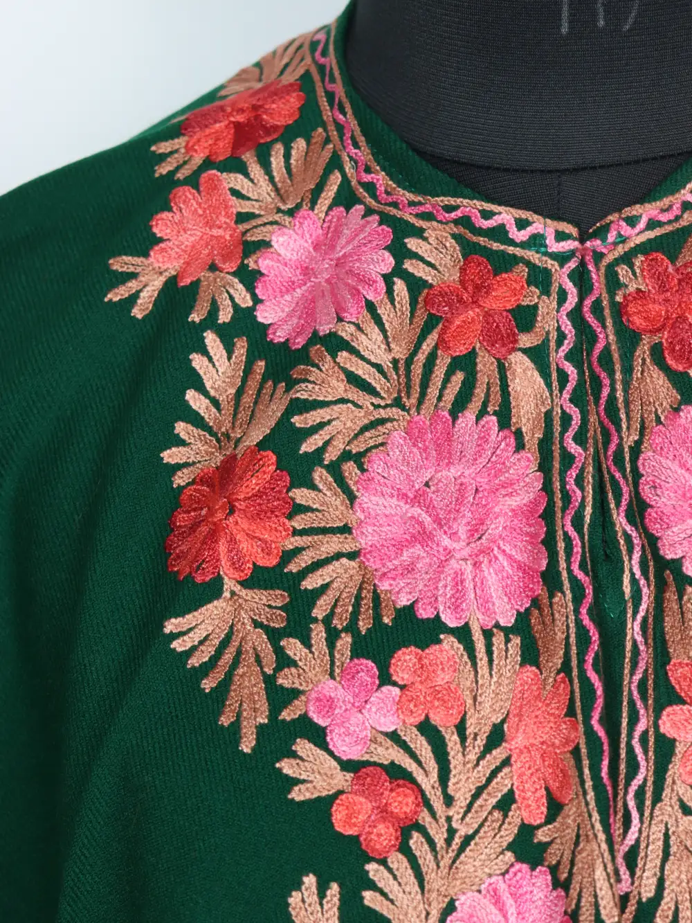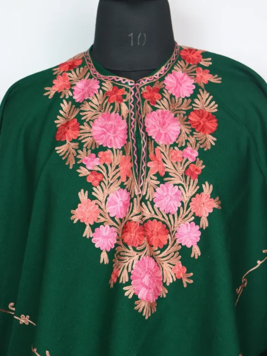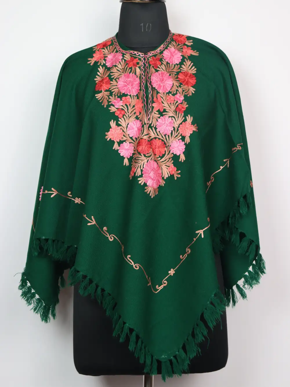 Woven in soft Cashmilon wool, this poncho has a clean Aari embroidery around the neckline with matching threadwork at the border. The side width is 60 inches with lenth 30 inch, giving it a flexible fit.