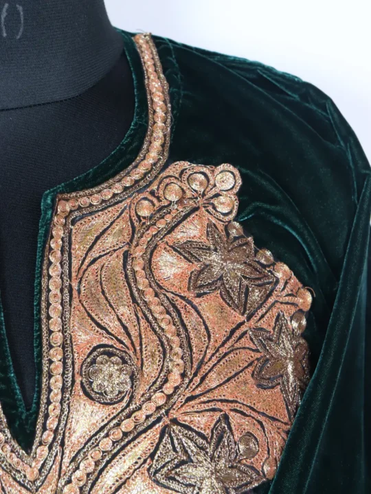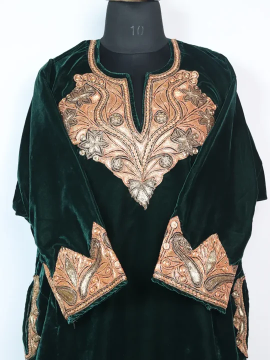 A dark green Kashmiri phiran dress in Velvet bears Bottle Tilla at the neckline, sleeves and border in floral patterns and it includes pockets on both the sides for useful wear
