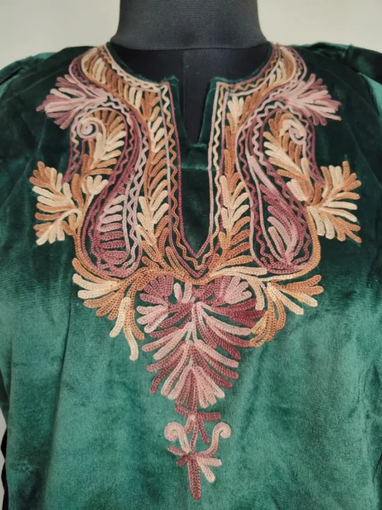 In pure Makmal, the dark green color Pheran Set for girls, carries dark brown badam style floral Aari kadhai at the neckline, which turns simplicity into charm. The soft black fabric drapes gently. It is ideal for 12-13-year-olds with a 45-inch chest and 35-inch length, it promises both warmth and style. It comes with a matching trouser for complete style. It is an adorable choice from pheran from Kashmir for kids selections.