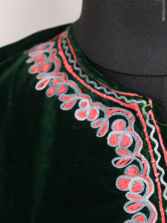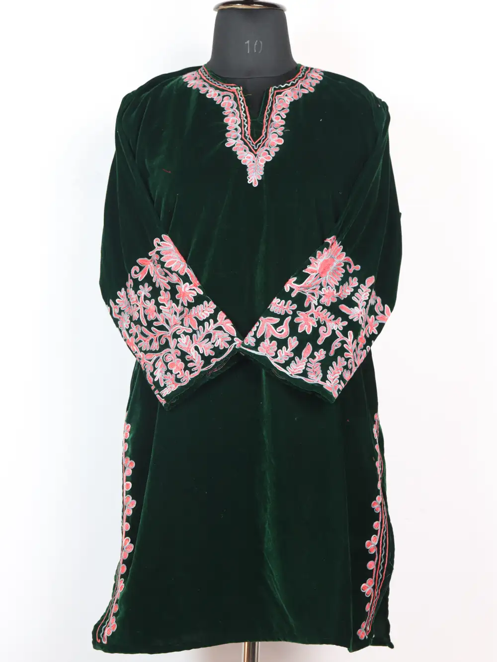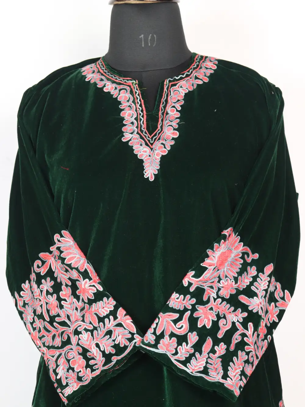 This kurti in deep green velvet 9000 micron offers both elegance and warmth. The neckline and sleeves are highlighted with floral motifs created through Aari embroidery in fine red threads outlined with grey hue threads. It is soft to the touch and easy to wear, it adds a sense of richness to everyday styling. It is perfect for winter, it blends comfort with detailed artistry in a way that feels timeless.
