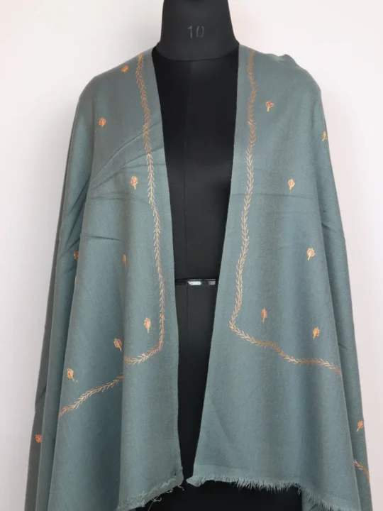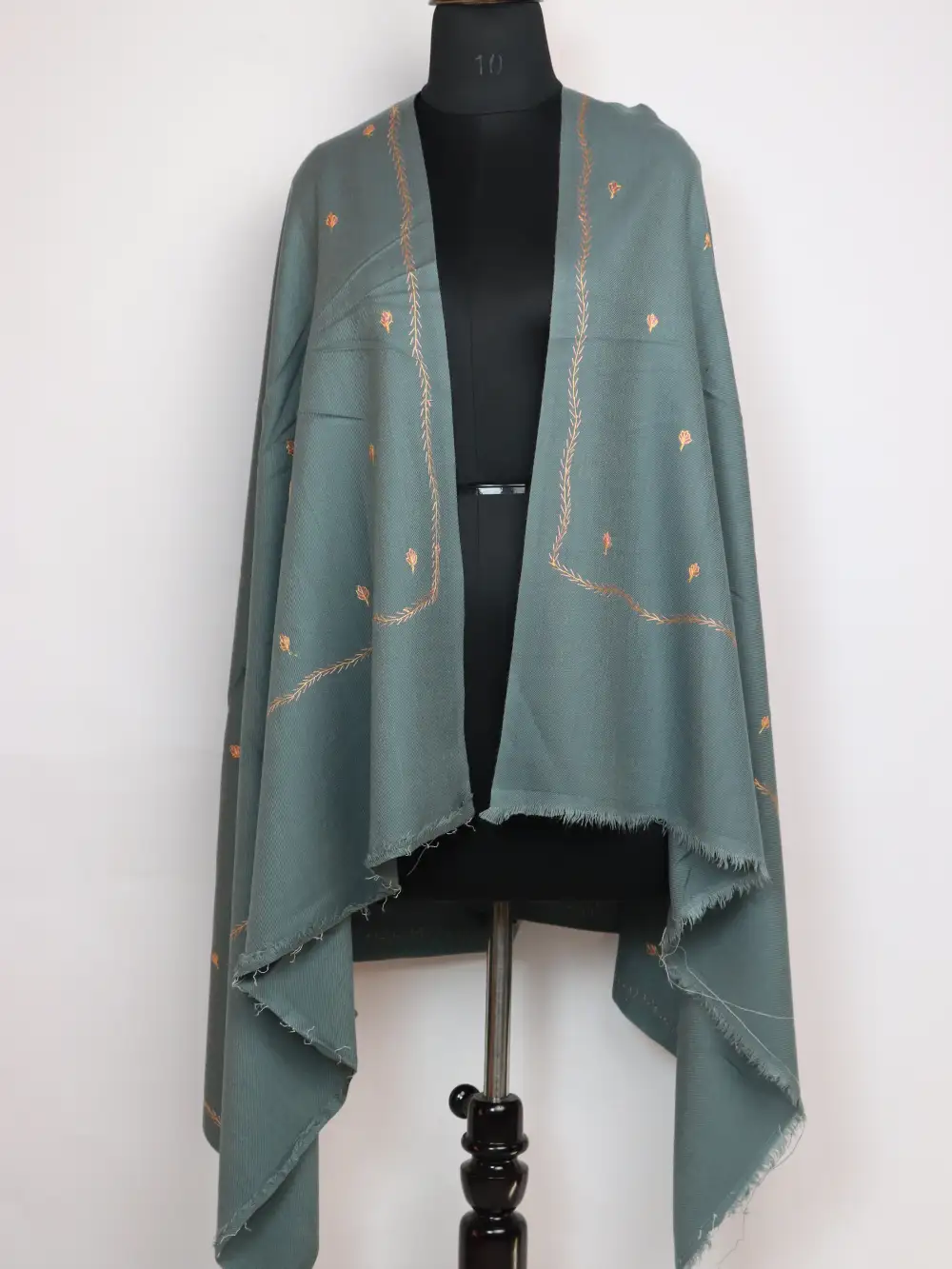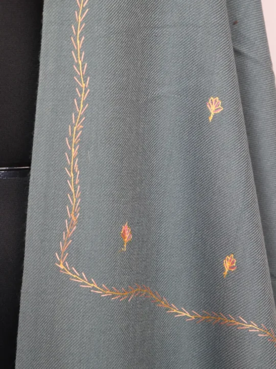 Darkk grey Cashmilon Wool shawl and hand sozni stitching across the border with floral corner motifs define this women’s shawl as quietly Kashmiri. This shawl folds into a compact bundle yet unwraps into a warm, textured drape.