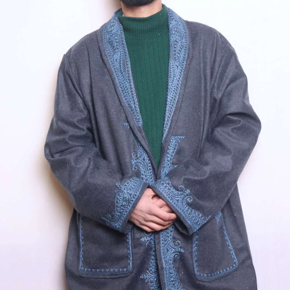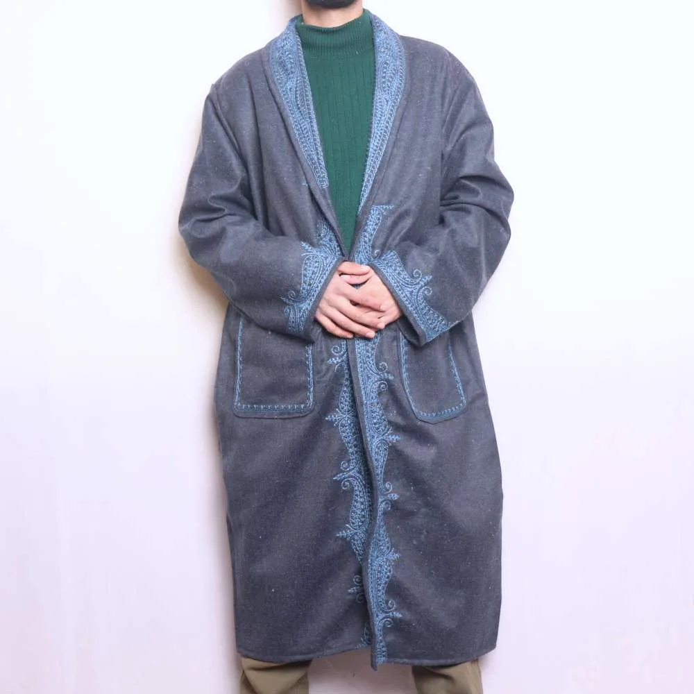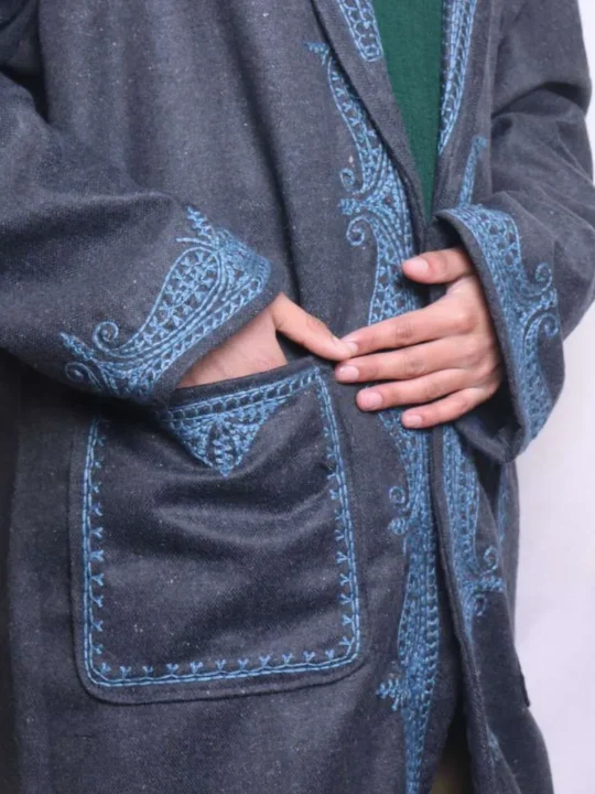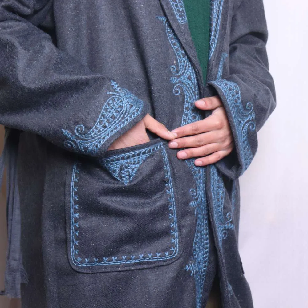 .This dark grey Gown is a timeless piece. It features stunning Aari embroidery. It is perfect for winter wear, and it combines traditional elegance with contemporary style. Its soft fabric ensures warmth and comfort, making it an essential winter garment.