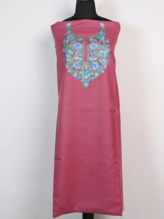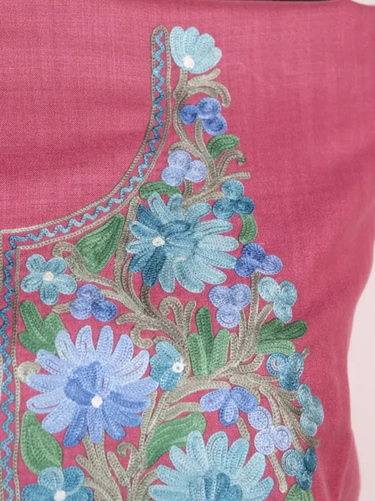 Crafted from Ruby cotton, this dark pink 2pc suit arrives unstitched, ready to be tailored to your liking. Its neckline carries Aari embroidery, where floral motifs in blue and purple shades meet green leaf details in harmony. Together they add elegance to the fabric, which makes it suitable for women who want comfort with a refined accent. Once it is stitched, it will become a timeless addition to your wardrobe.