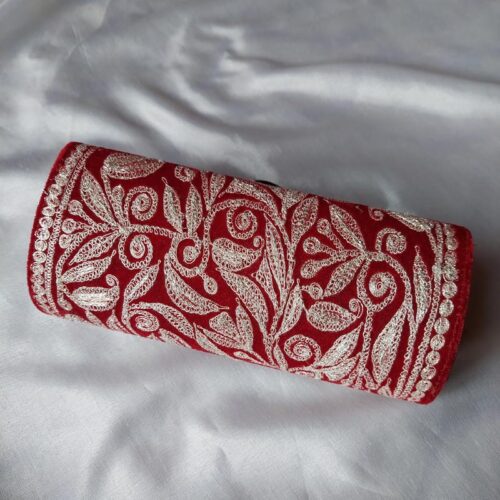 This makhmal clutch is dark red in color and has beautiful silver tilla work on it. This will be perfect with your black pheran or black suit or black dress.