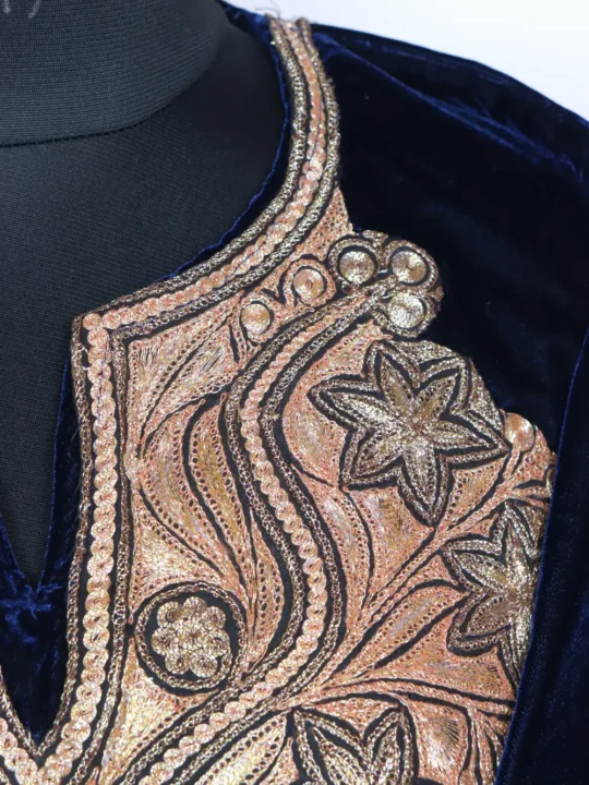 Blue Velvet makhmal body with Botte Tilla curved floral patterns at the neckline, sleeves and border, creates this understated, formal Kashmiri Pheran, it comes with pockets which has been kept both sides for practicality. This designer Pheran keeps the embroidery focused on the neck so the piece remains wearable for events while showing metallic thread blossoms in careful arrangement.
