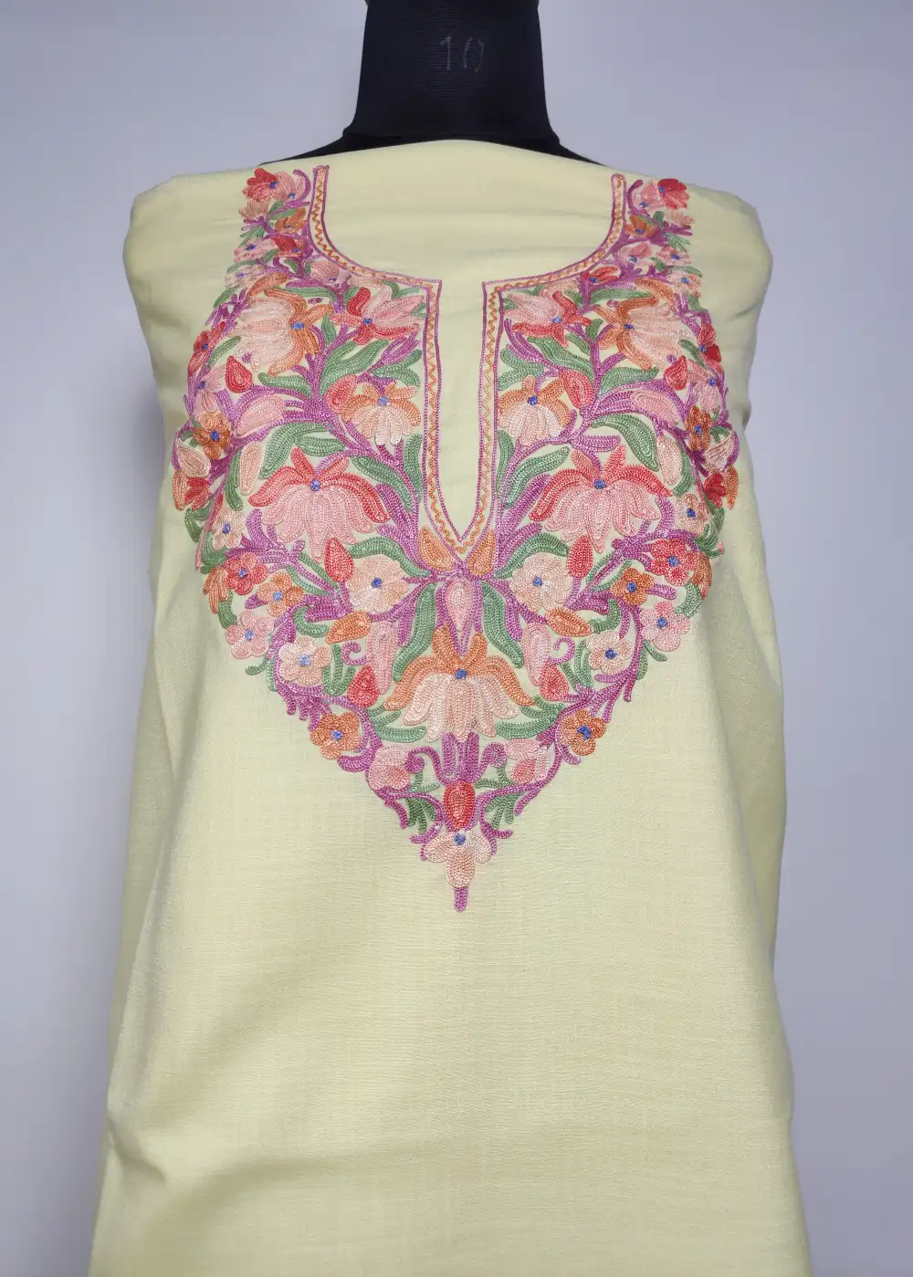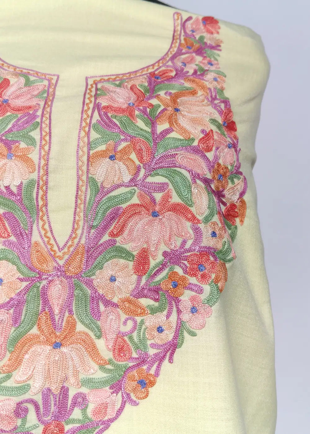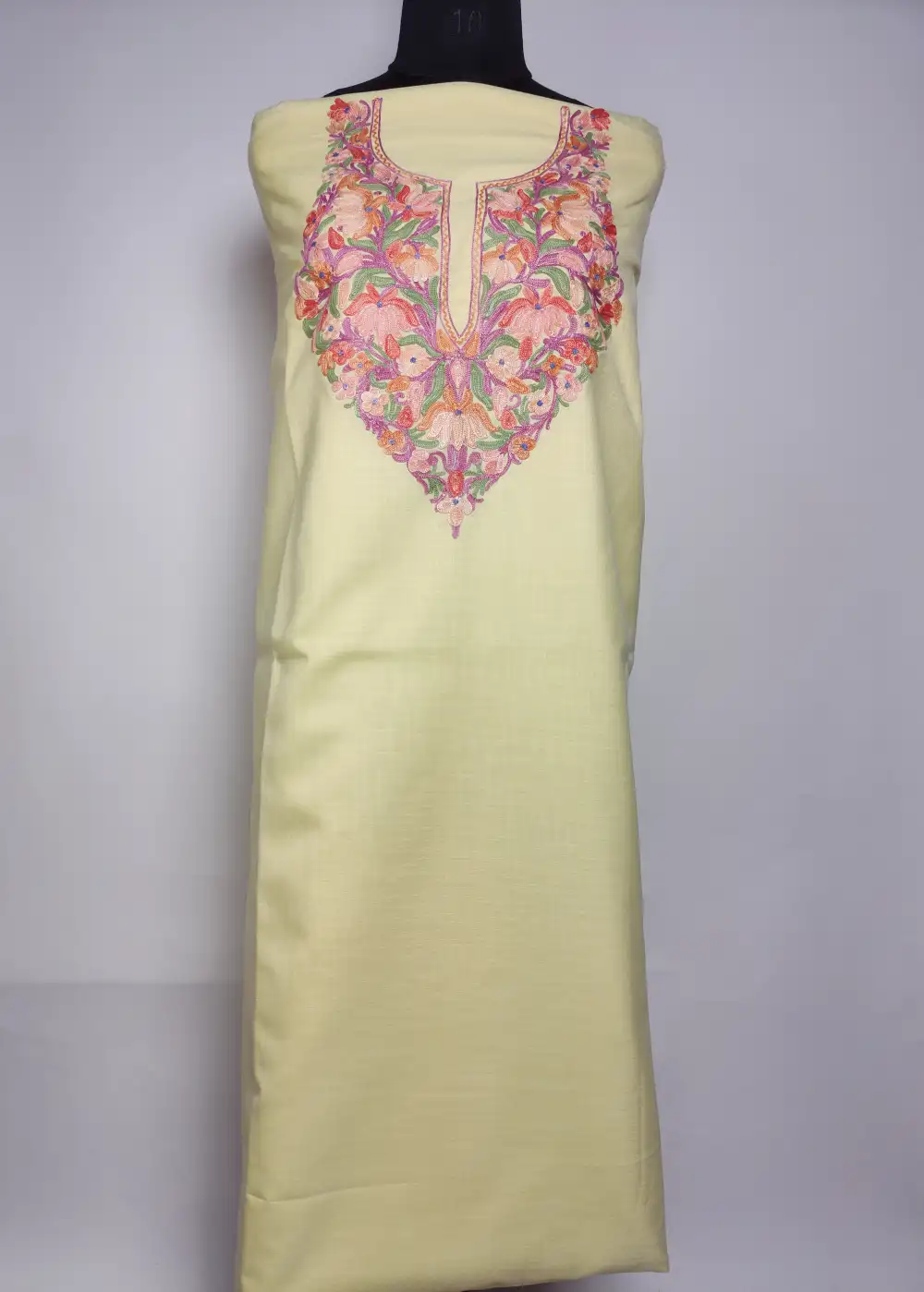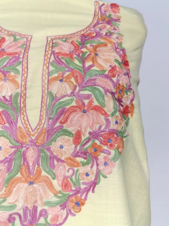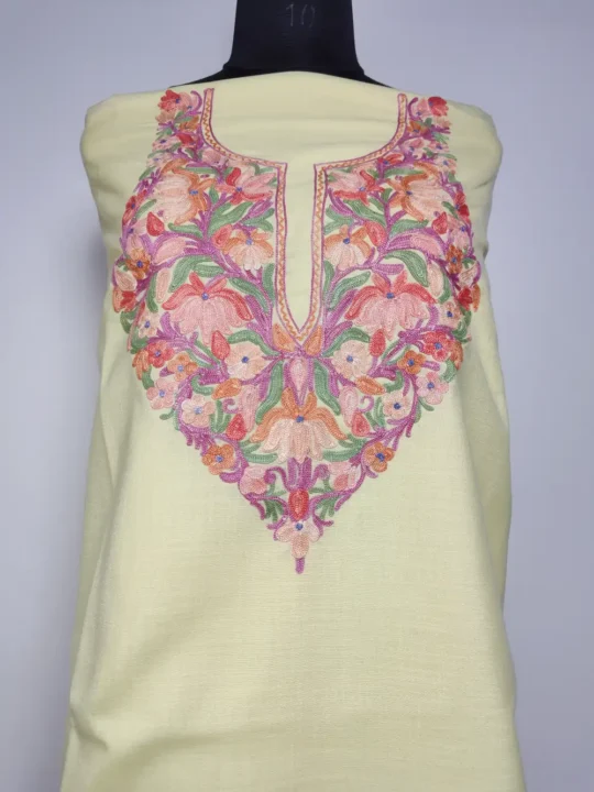 This beautiful Pastel Yellow color embroidery suits for women piece in ruby cotton features elelgant posh bagh Aari kadhai around the neckline that gives it a rich traditional look. The fabric feels smooth and light, helping you stay relaxed even on warm days. An excellent pick from cotton summer suits, provided unstitched for custom tailoring.
