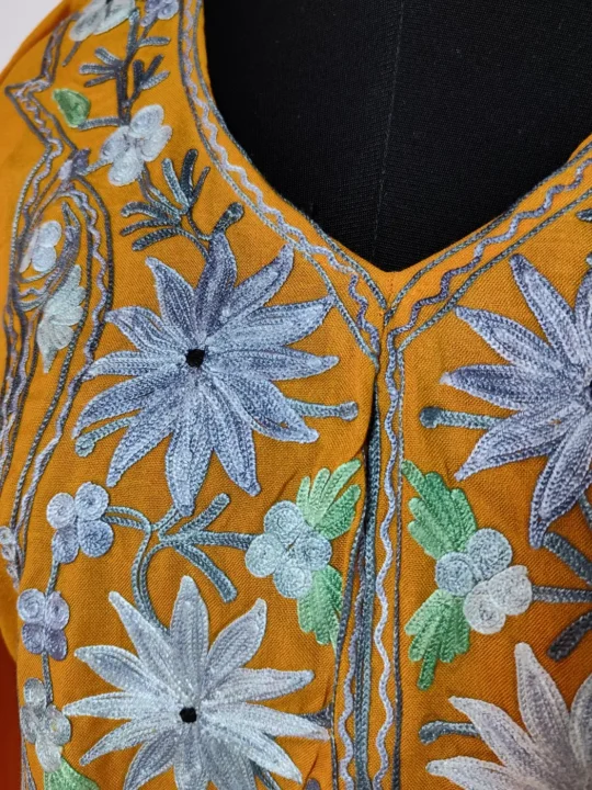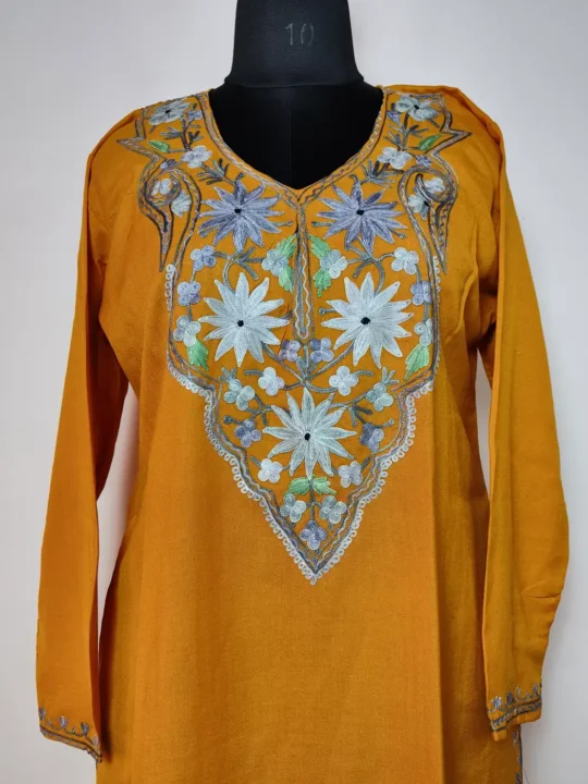 Kashmiri kurta coord set has crafted in summer cool cotton. Itincludes kurti and trouser combination. Its mustard base with Kashmiri floral aari embroidery on neckline adds charm.