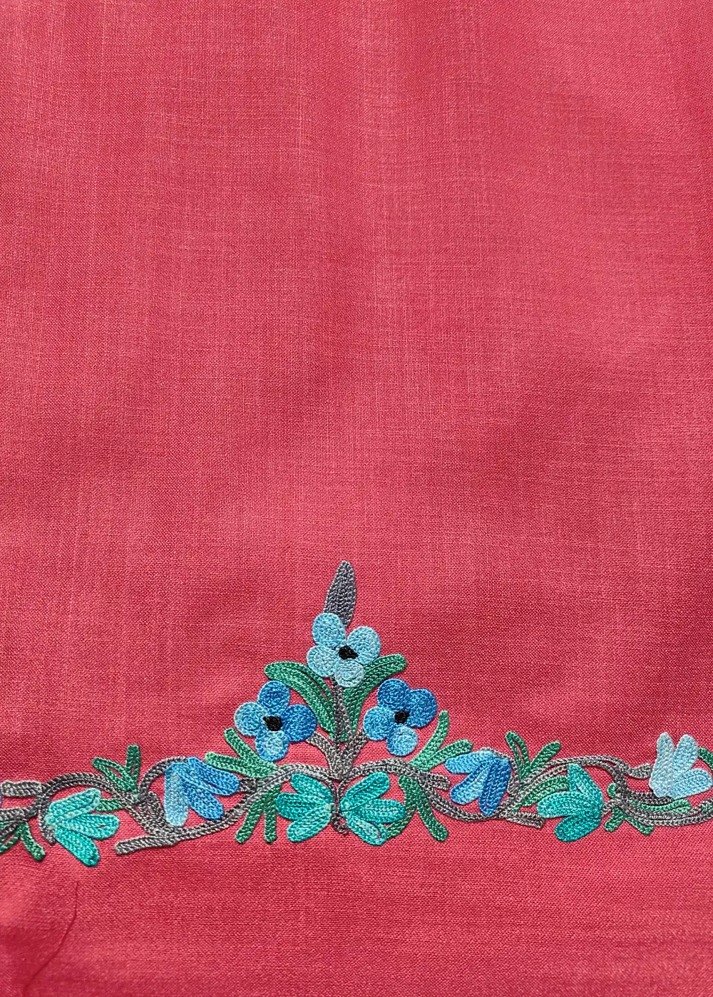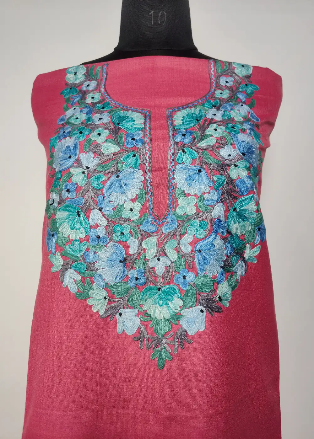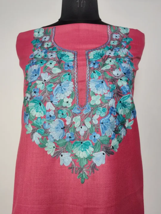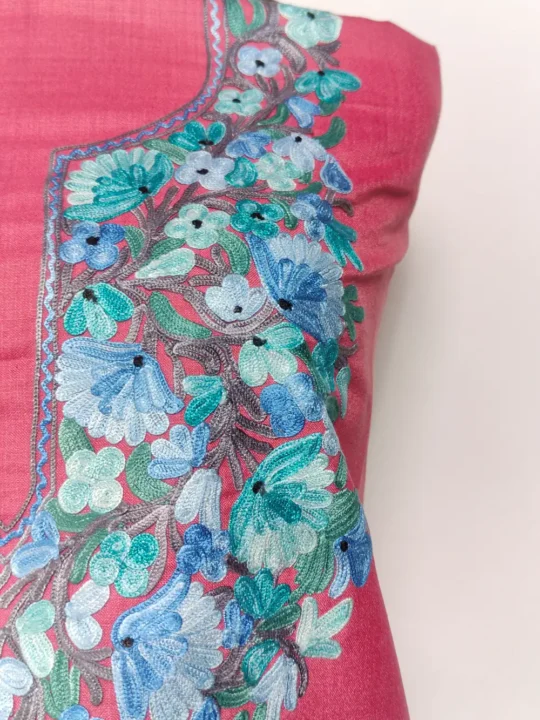 This kashmiri kadai suit with ruby cotton fabric features gorgeous floral Aari embroidery at the neckline that gives a fine traditional finish. The breathable cotton helps in staying cool and relaxed even in peak summer. A good Kashmiri suit material option, offered unstitched for personal fitting.