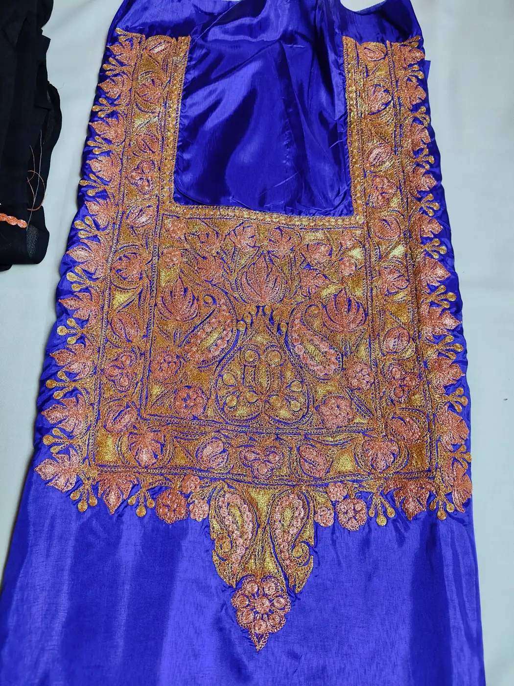 A soft contrast of black and dark blue defines this 3pc Kashmiri unstitched suit set. Botte tilla embroidery in geometrical pattern enhances the neckline, while the dupatta carries fine line work along its borders. This 3pc includes kameez, salwar, and dupatta, left unstitched for your own fit.
