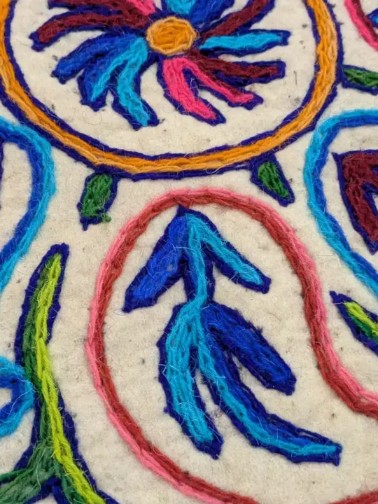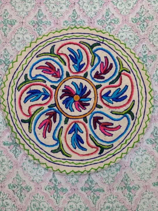Crafted with precision and care, this 2 ft Round Cotton Wool Namda is a true representation of Kashmiri textile artistry. It is made from a blend of soft cotton and pure wool, it features intricate Hand Aari embroidery, adding a timeless charm to your space. Whether placed in a cozy reading nook, as a meditation mat, or an accent piece in your living room, this Namda enhances the warmth and beauty of your home. Its detailed work and detailed motifs make it an elegant addition to any decor.