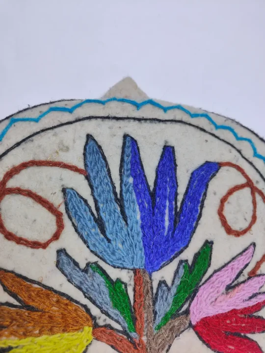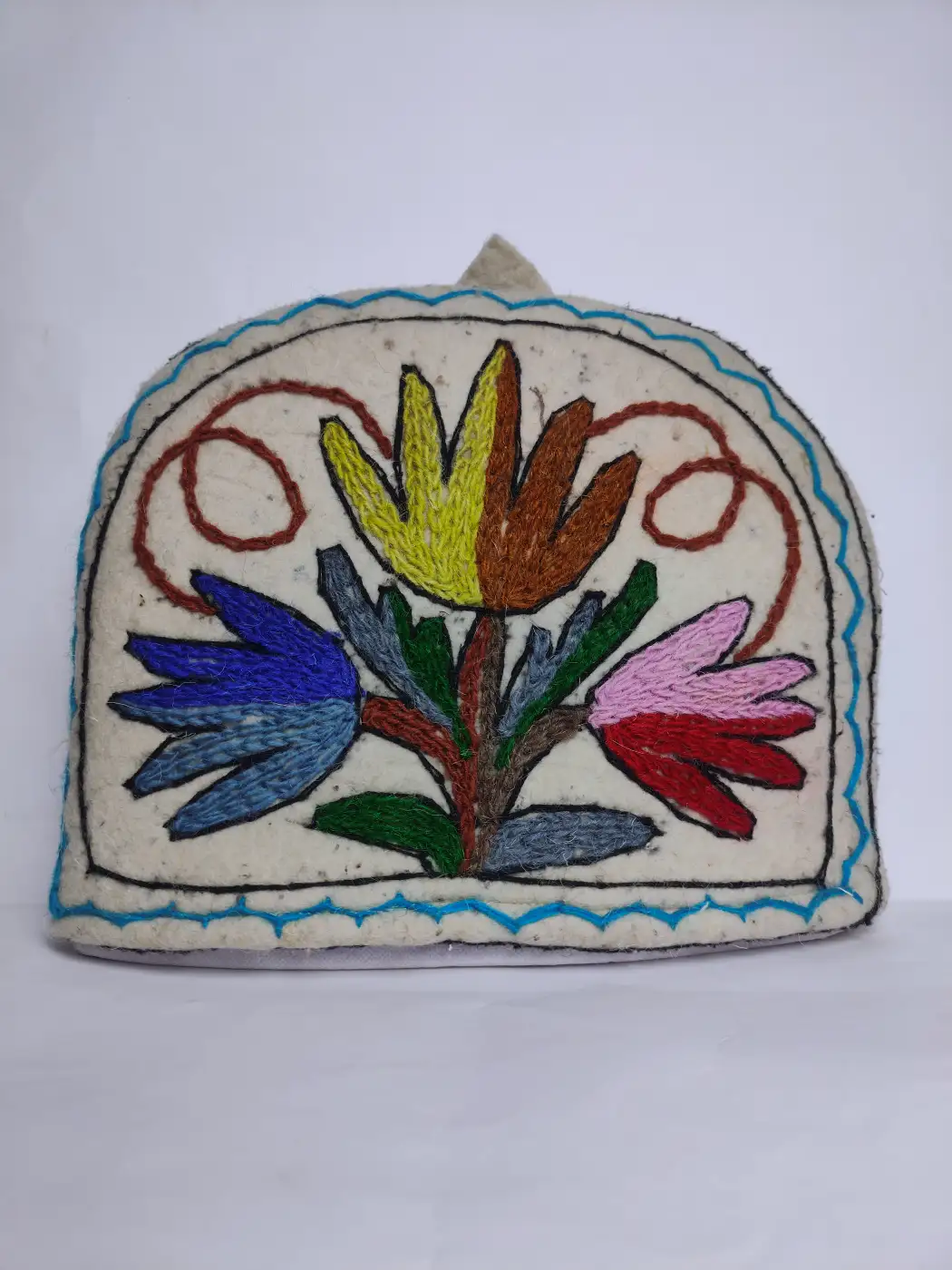 This isn’t just a tea cozy, it’s a piece of Kashmir you can touch. Made from proper wool namda and decorated in hand Aari embroidery. No machine, no print. Just an artisan in Kashmir spending days with to bring flowers to life on that namda wool base base. This wool namda keeps your chai hot, while the hand Aari work makes your table look beautiful.