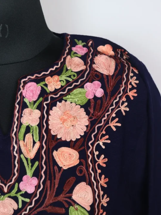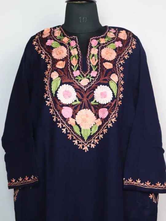 This cashmilon wool pheran has soft fabric with posh bagh aari embroidery around the neckline, giving it a clean and elegant look.