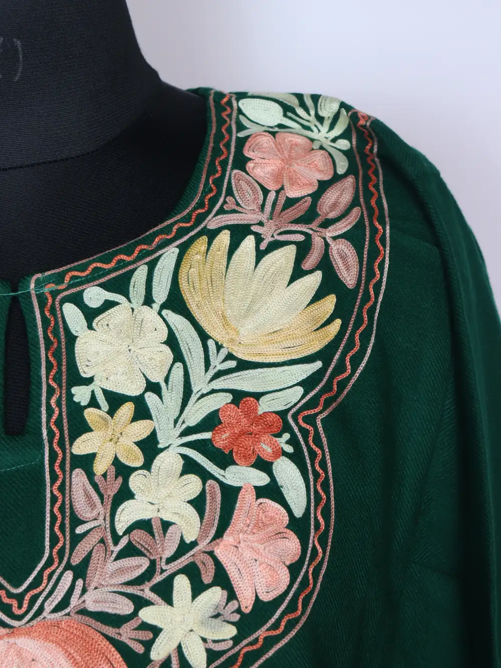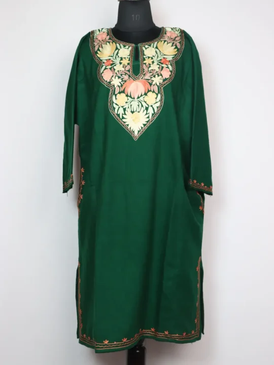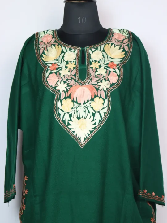 This cashmilon wool firan comes with elegant floral aari embroidery around the neckline, giving it a clean and graceful look perfect for everyday wear.