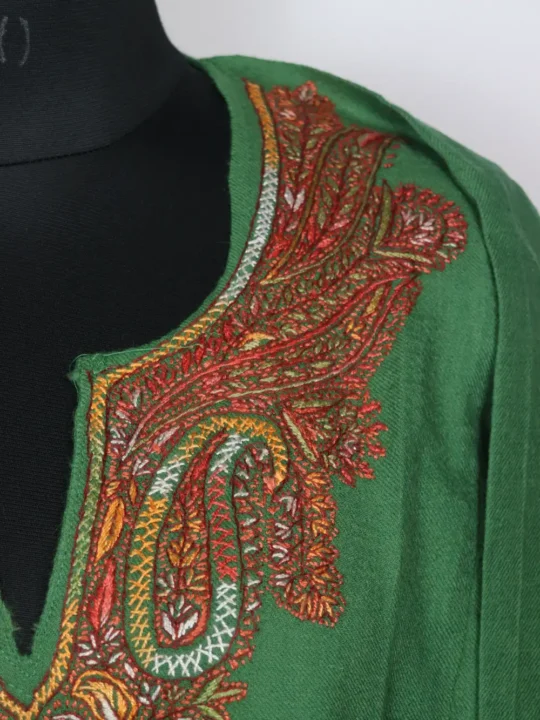 This Raffal wool pheran shows hand sozni badam embroidery around the neckline that feels decent, classic, and true to Kashmiri craft.