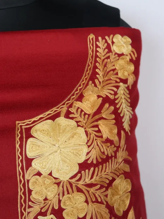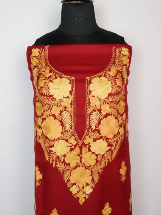 Crafted in polywool for a warm, soft feel, this 3pc suit features beautiful floral aari kadhai with bootis spread all over front. It comes unstitched and includes kameez, salwar, and dupatta for stitching to your size.